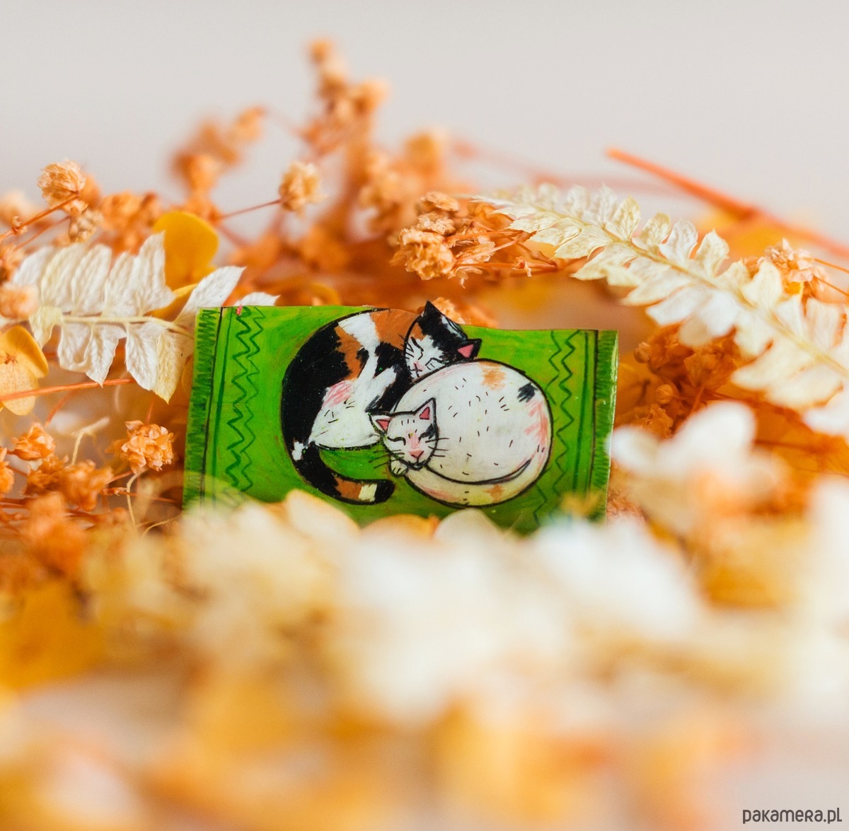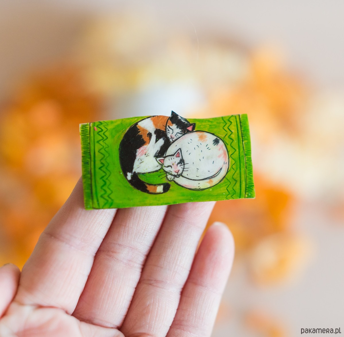 Kotki zostaną spakowane w tekturowy kartonik z "siankiem" nawiązującym kolorystycznie do broszki.