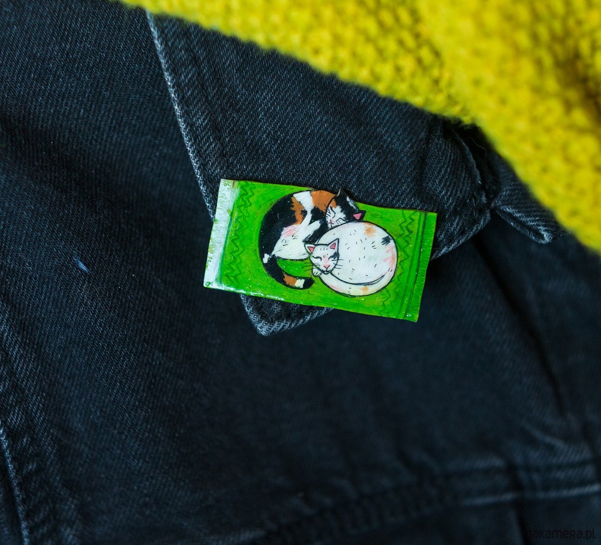 Broszka została ręcznie narysowana kredkami przez kocią matkę.