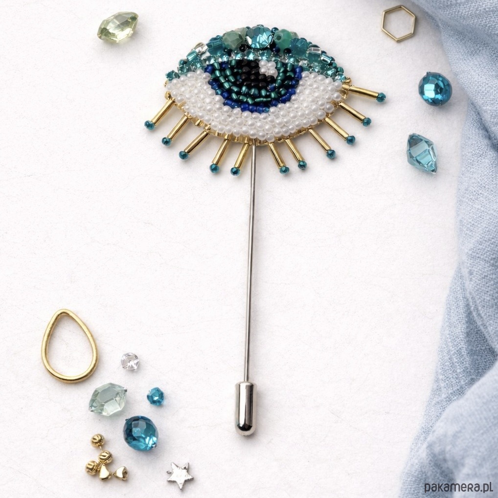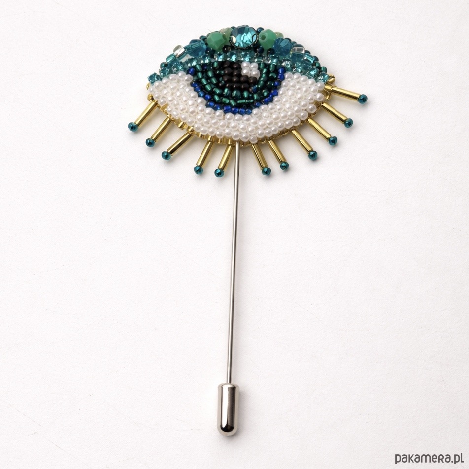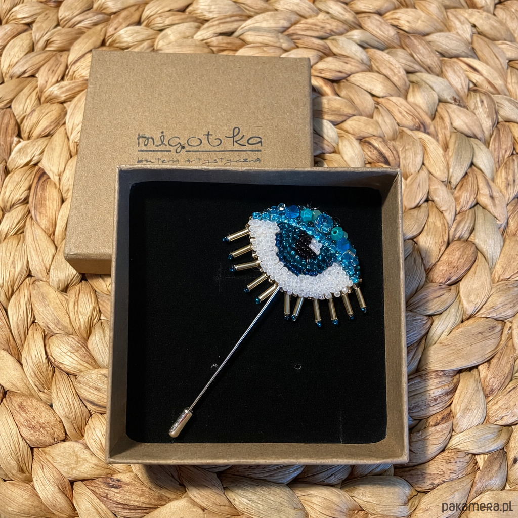 Efektowna broszka na długiej szpilce z motywem oka, wykonana ręcznie techniką haftu koralikowego. To wyjątkowy dodatek inspirowany symboliką oka ochronnego, kojarzonego z intuicją, uważnością i dobrą energią.