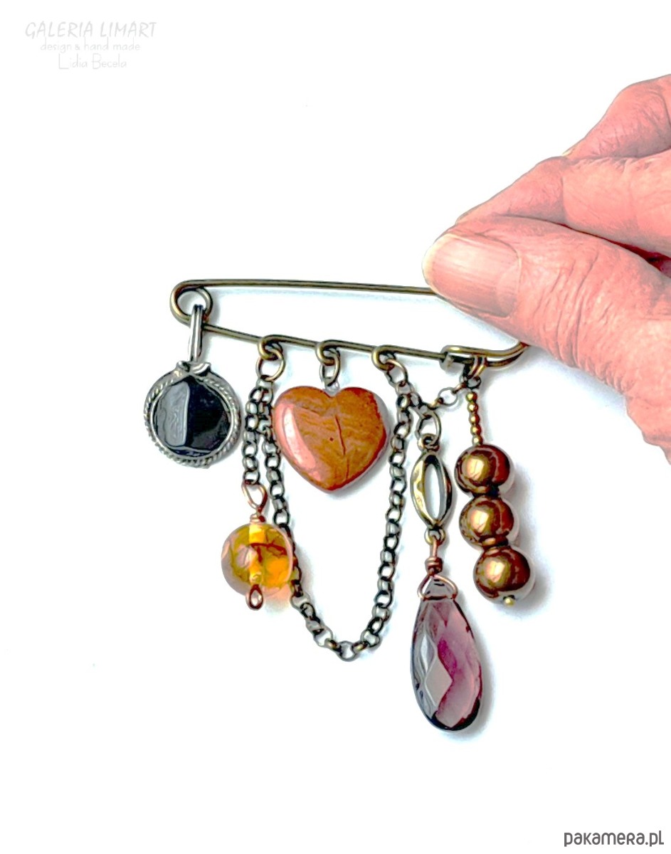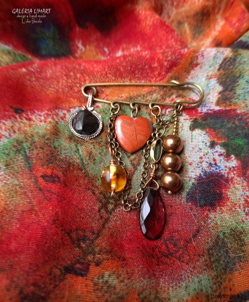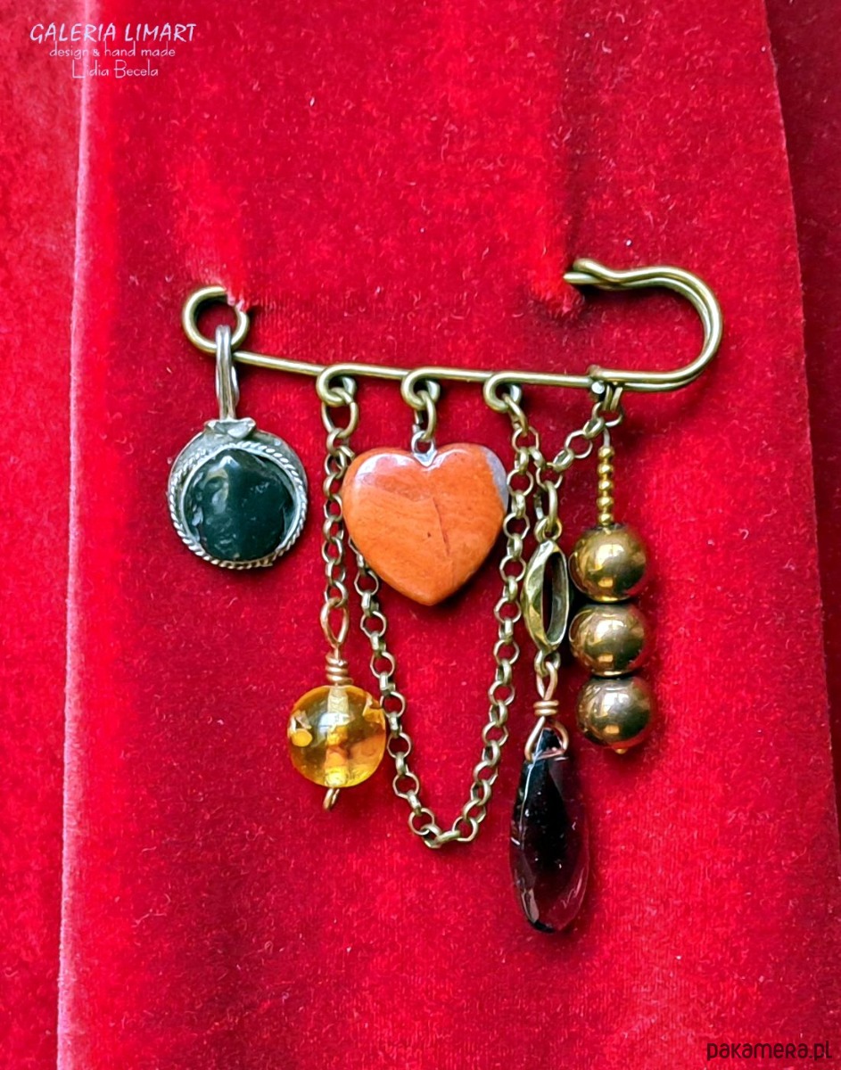 Broszka niezwykła na agrafce w stylu Boho handmade z sercem z jaspisu unikat
