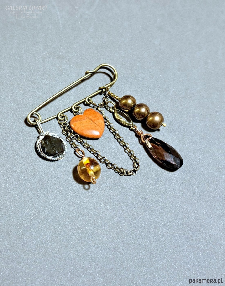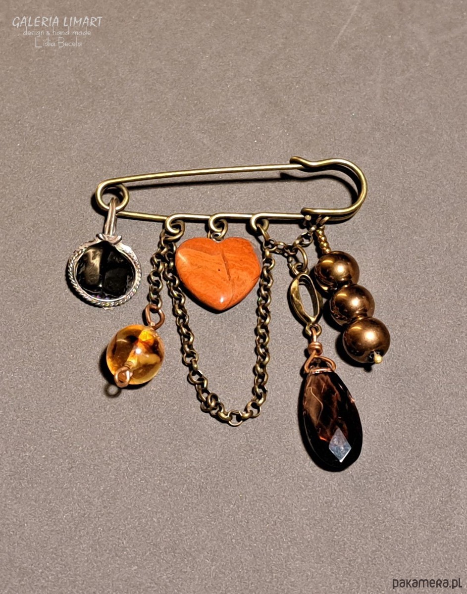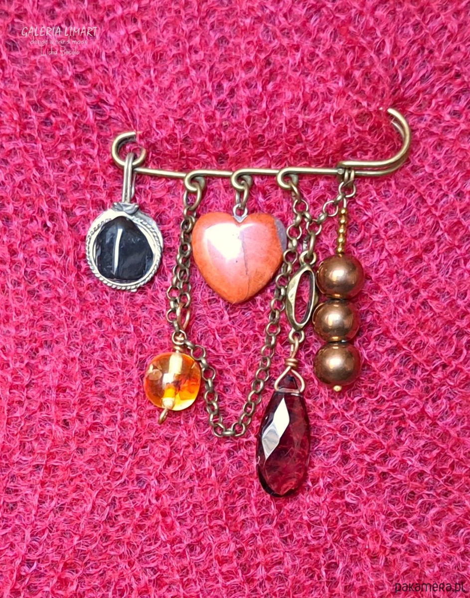 Autorska eklektyczna kompozycja utrzymana w bardzo modnym stylu BOHO. Cudne urocze serduszko z jaspisu brekcja ozdobione różnymi starymi (z kuferka) przywieszkami: agat na metalu, kulka z żywicy z zatopionymi bursztynkami, łezka z kryształu Swarovskiego, 3 kule złotego hematytu, to wszystko zawieszone na mosiężnym łańcuszku zwisającym z wielkiej mosiężnej agrafy. Niepowtarzalna, ciekawa i niezwyczajna kompozycja.