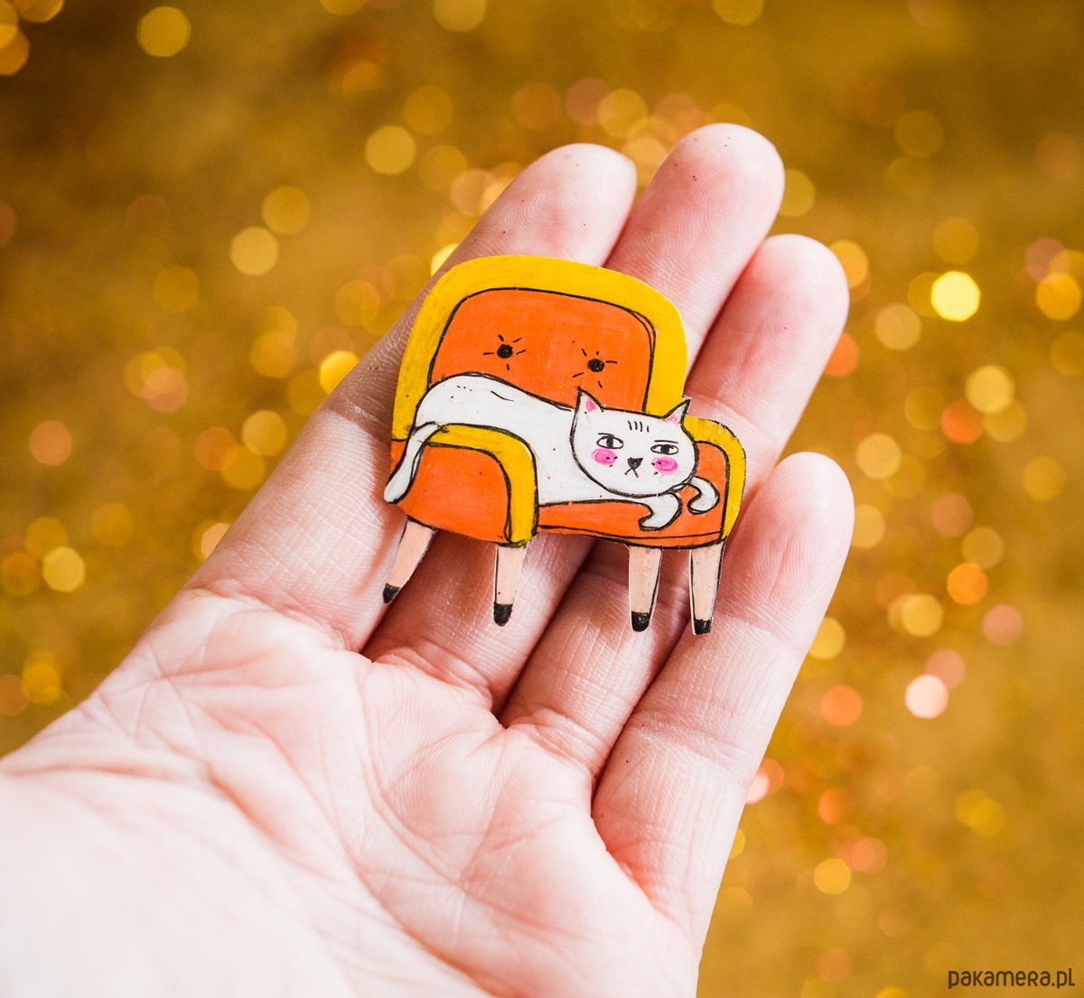 Zabawna broszka z obrażonym kotem leżącym na fotelu to pełen humoru dodatek, który przyciąga wzrok i wywołuje uśmiech. Przedstawia kota w typowej, „fochowej” pozie, rozłożonego na swoim ulubionym fotelu – idealna propozycja dla miłośników kotów i lekkiego, żartobliwego stylu.