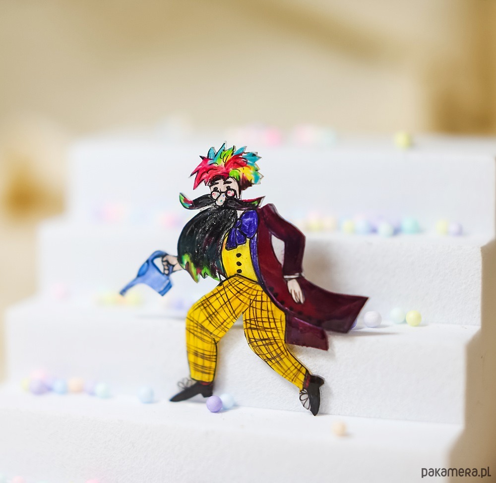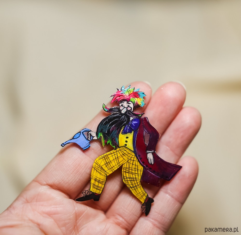 Broszka z Panem Kleksem została ręcznie narysowana, oraz zabezpieczona lakierem ekologicznym.