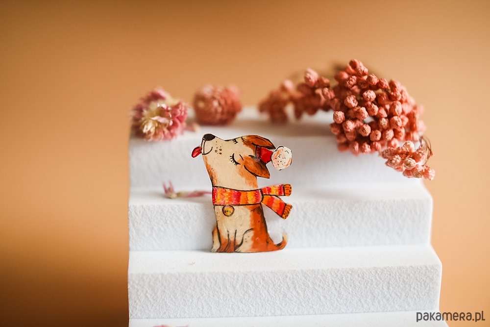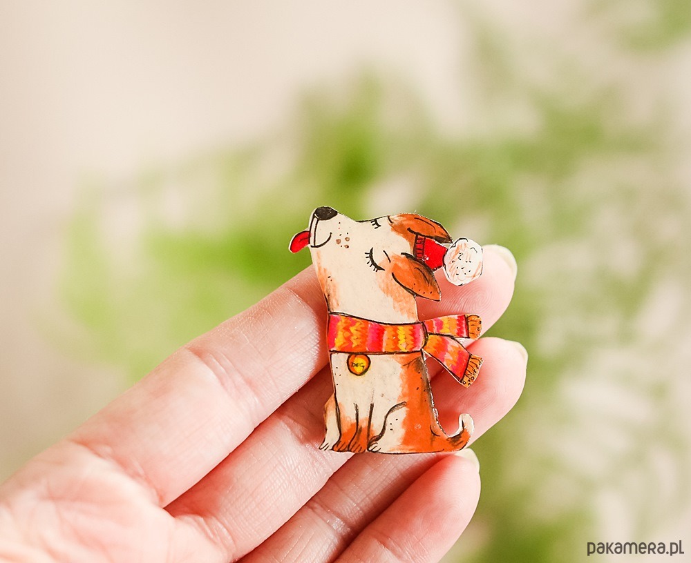 Broszka ukazuje psa Azora w stylizowanej, lekko humorystycznej odsłonie. Zwierzak ma na sobie miękki szalik, który otula jego szyję, oraz czapkę dopasowaną do całości – dodającą mu uroku i odrobiny zimowego klimatu. Sylwetka psa jest wyraźna i starannie wykończona, a subtelne detale podkreślają jego sympatyczny charakter.