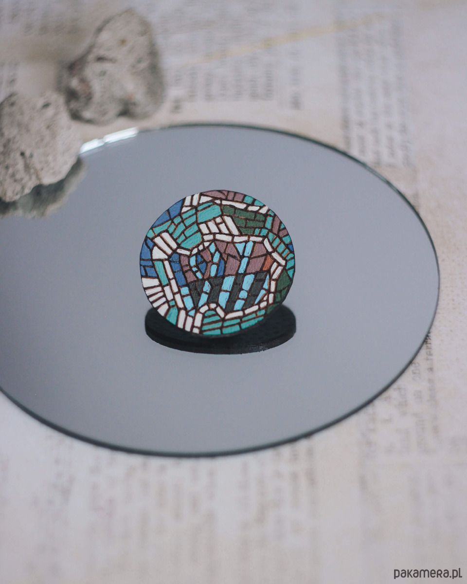 Ręcznie wypalany i malowany pin ze skóry naturalnej z drugiego obiegu.