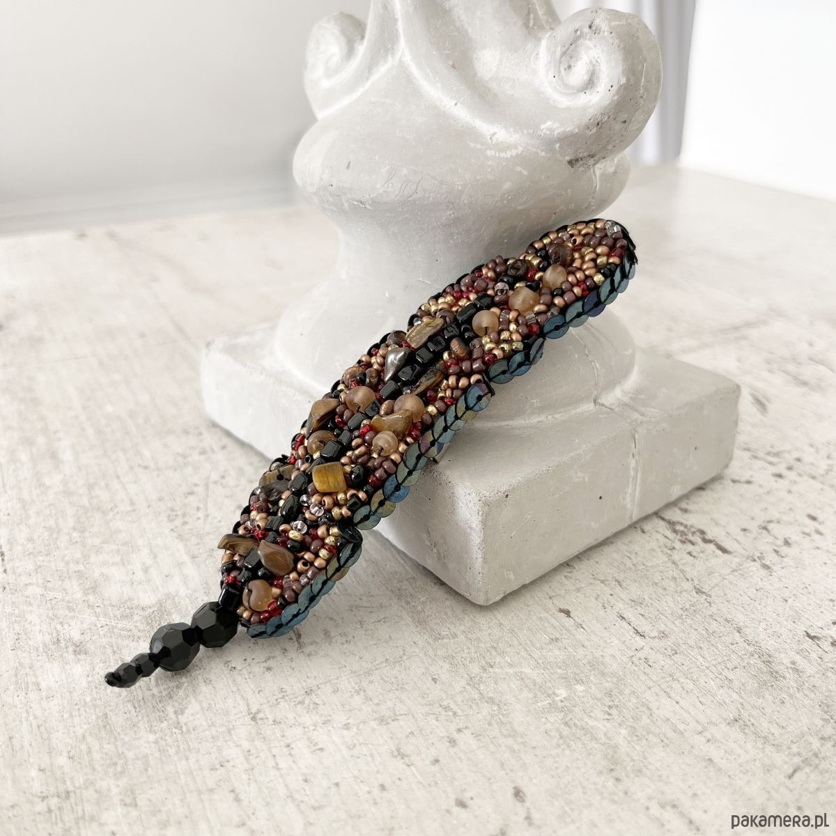 Wymiary broszki 12 x 3 cm. Z tyłu znajduje się zapięcie o szerokości 4 cm.
