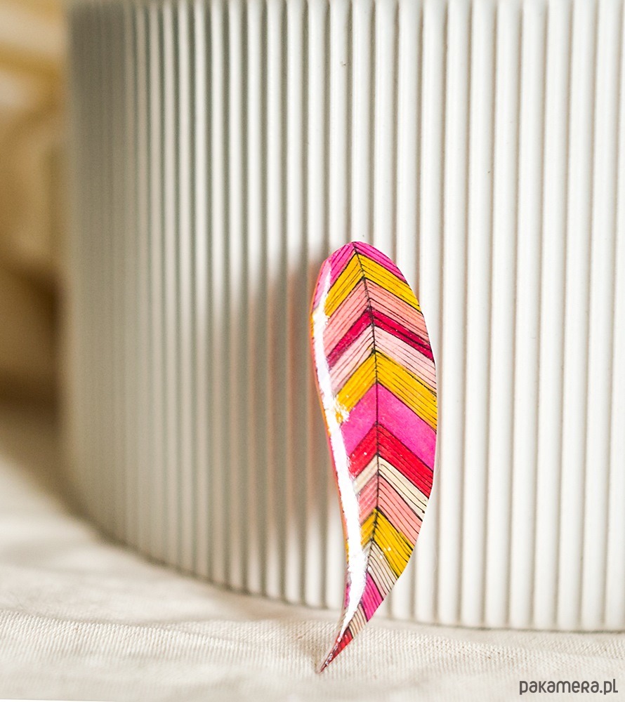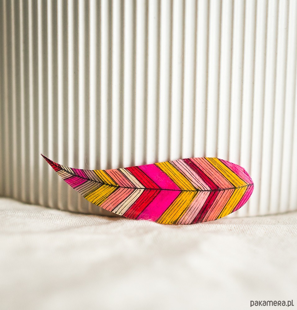 Ta urocza broszka w kształcie piórka zachwyca swoją lekkością i bogactwem barw.