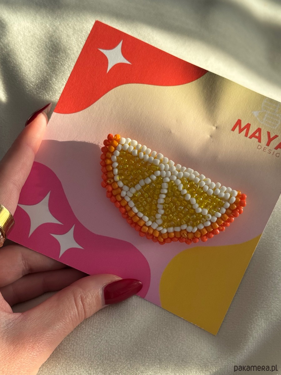 Ręcznie wyszywana koralikami broszka w kształcie pomarańczy!