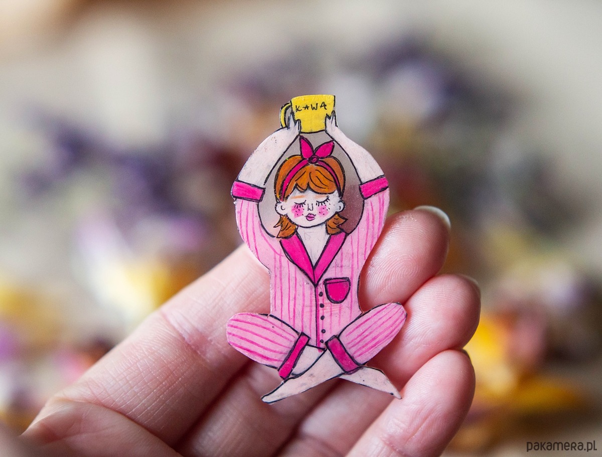 Broszka została ręcznie narysowana kredkami na folii termokurczliwej.