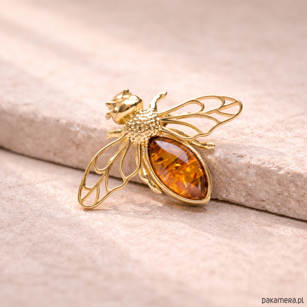 Broszka pszczoła z bursztynem w srebrnej oprawie — elegancka i ręcznie wykonana biżuteria dla miłośników przyrody oraz pszczelarzy. Unikalna, trójwymiarowa kompozycja łączy naturalne, starannie wyselekcjonowane kaboszony bursztynu bałtyckiego z pozłacaną, próbą oznaczoną srebrem .925. Misternie wykonane skrzydła i detale korpusu podkreślają realistyczny charakter motywu pszczoły, nadając broszce szlachetny i ponadczasowy wygląd.