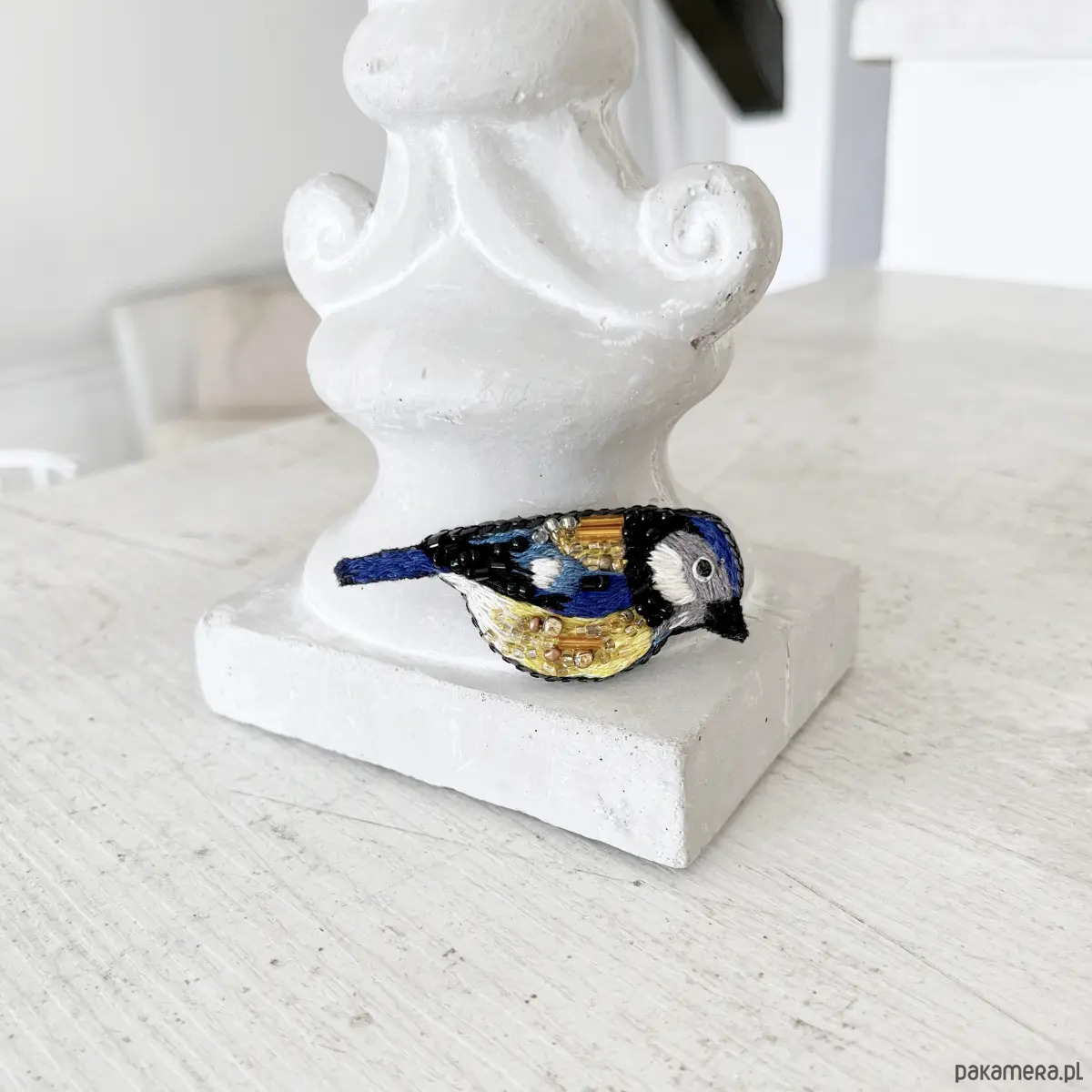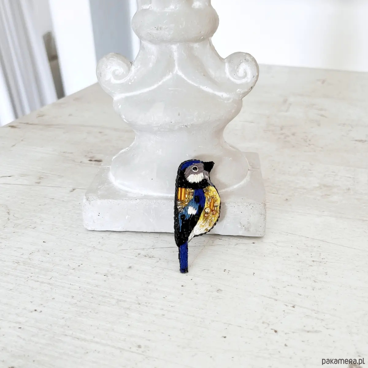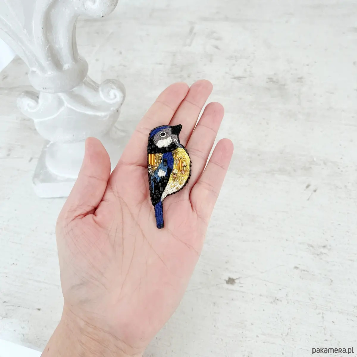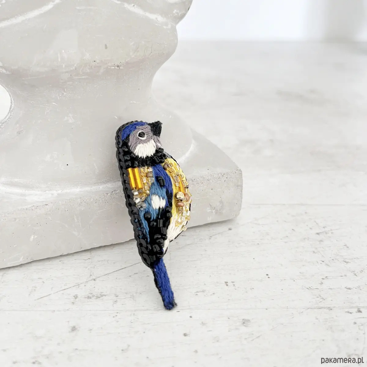 Broszka PTAKI SIKORKA 2 ręcznie haftowana przypinka koraliki haft