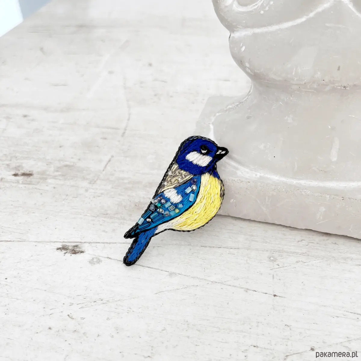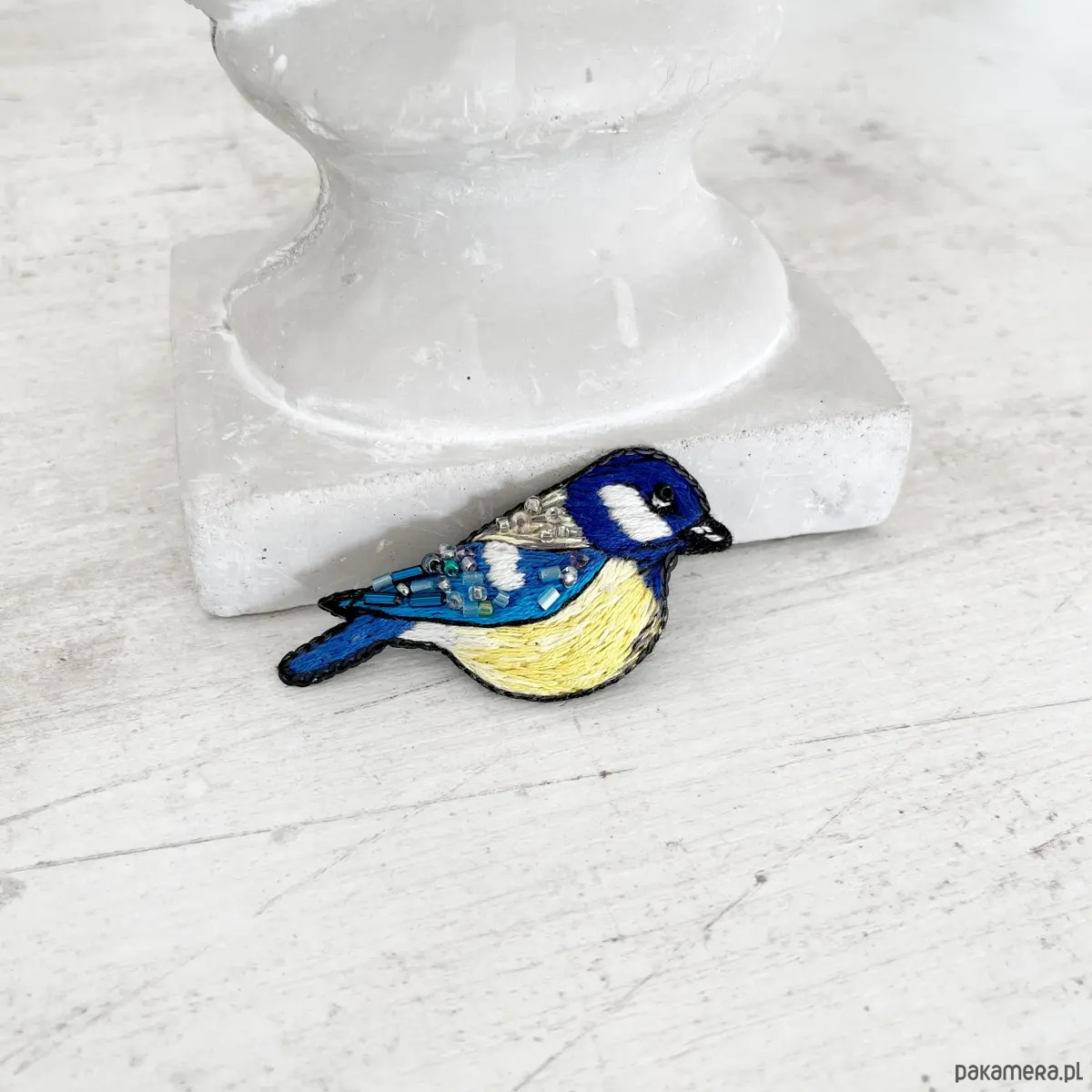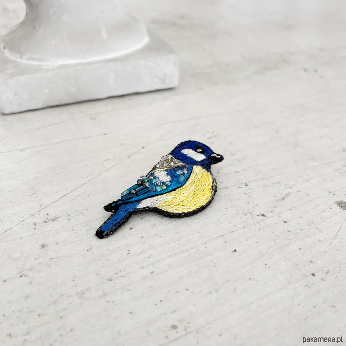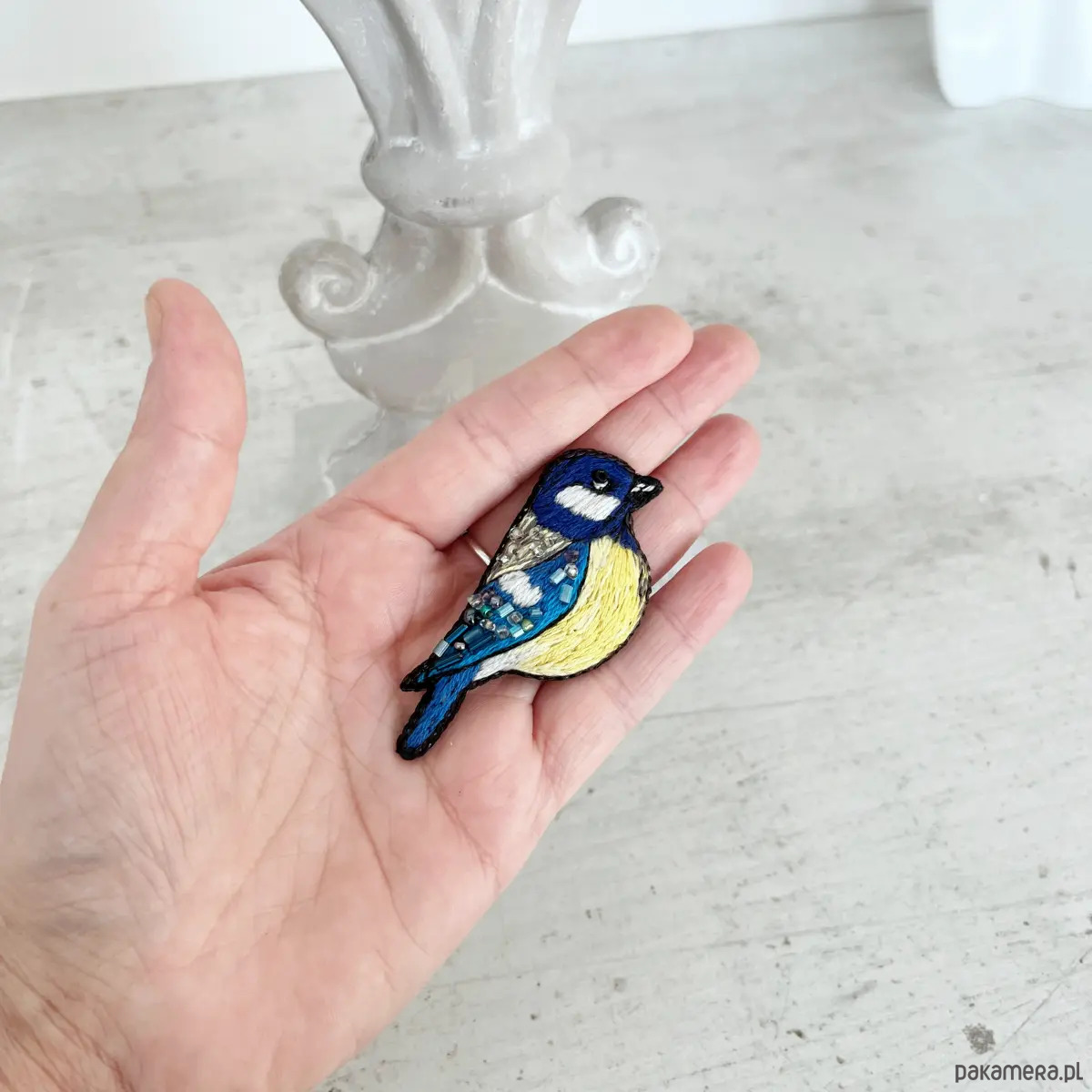 Broszka PTAKI SIKORKA 3 ręcznie haftowana przypinka koraliki haft