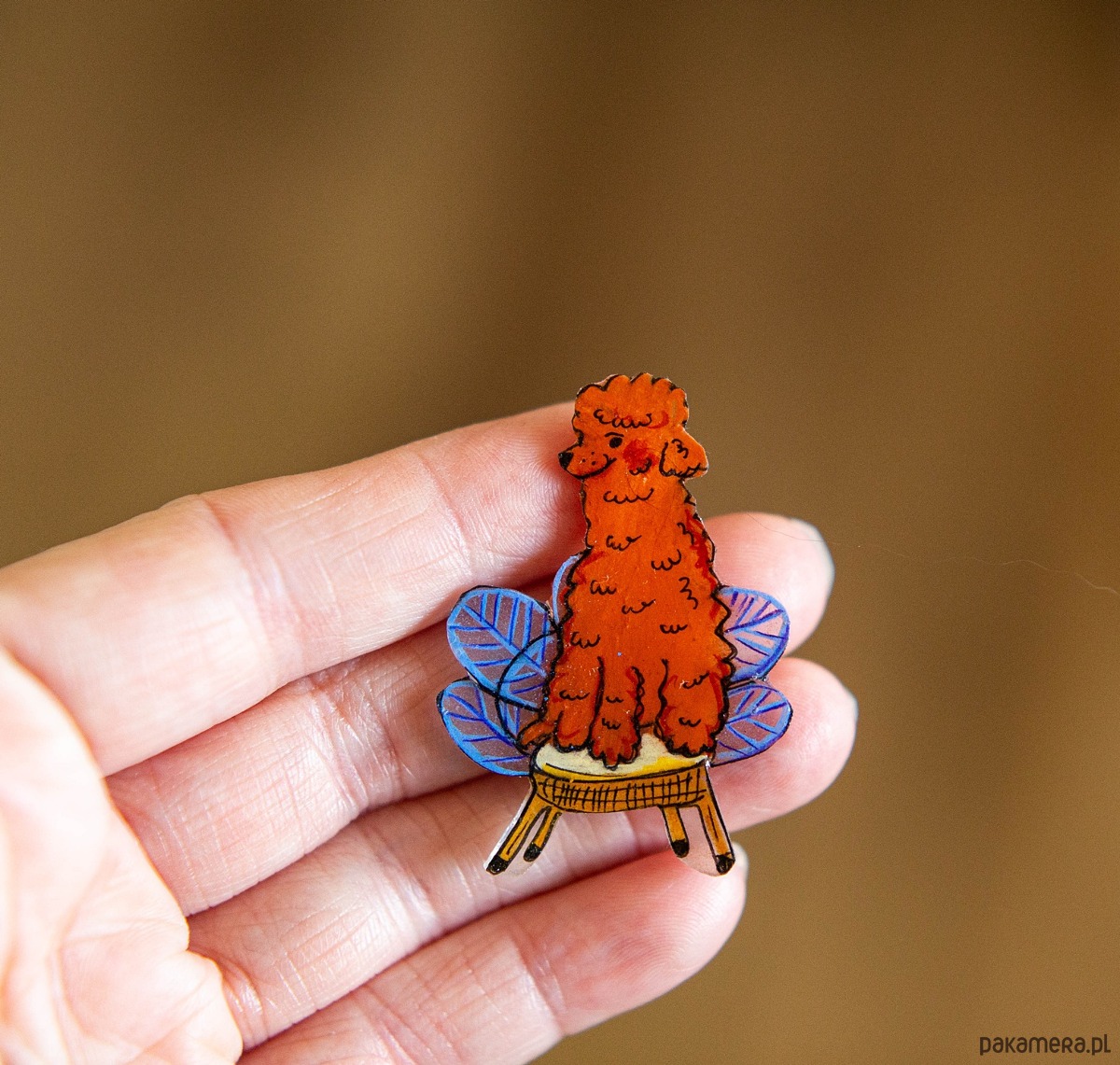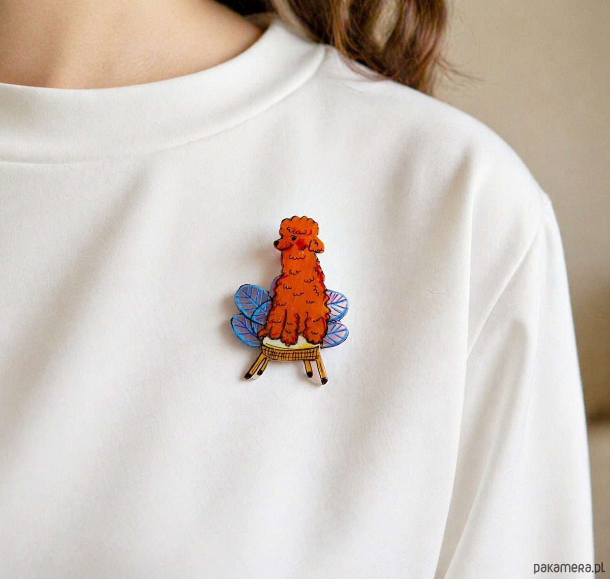 Urocza przypinka z pieskiem Karmelem to małe dzieło sztuki, które od razu przyciąga spojrzenia. Przedstawia białego, puszystego pudla siedzącego na stylowym krzesełku z dekoracyjnymi, turkusowymi liśćmi. Delikatne detale, subtelne rumieńce na policzkach i niewielka obróżka z serduszkiem nadają całości wyjątkowego, ciepłego charakteru.