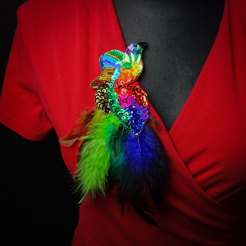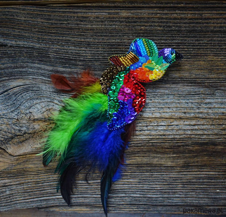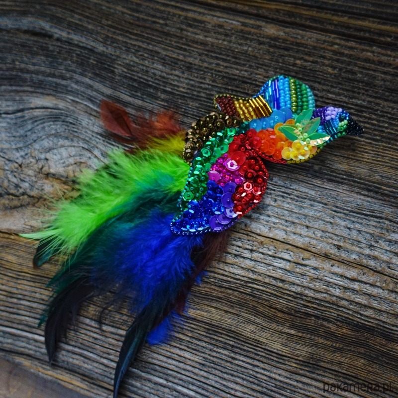 Broszka wykonana metodą haftu koralikowego, inspirowana barwnym, rajskim ptakiem. Bogata kompozycja kolorów i faktur nadaje jej wyrazisty, artystyczny charakter, a starannie dobrane materiały podkreślają dekoracyjną formę projektu.