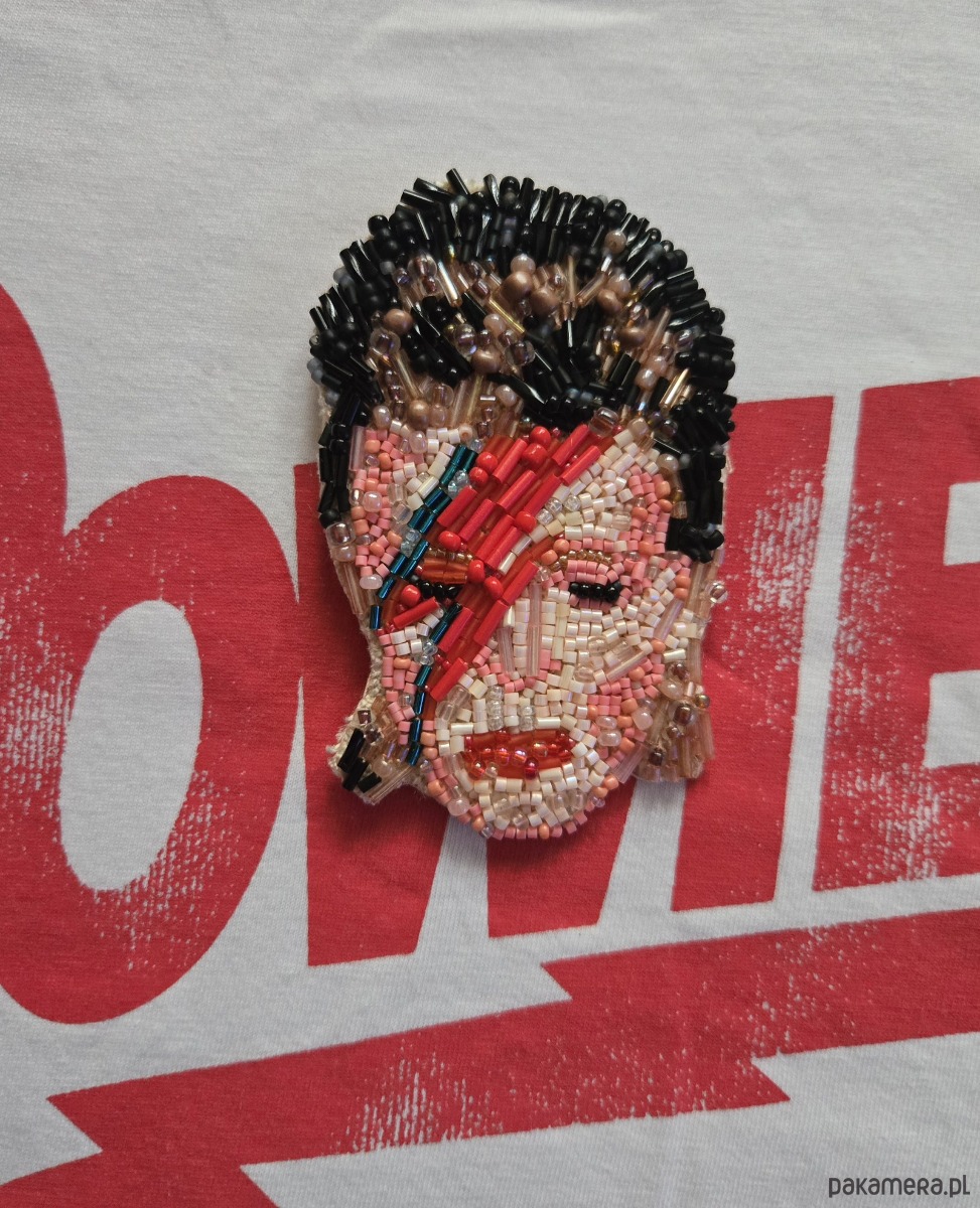 Unikatowa broszka wykonana metodą ręcznego wyszywania drobnymi koralikami. Przedstawia stylizowaną twarz postaci w charakterystycznym, glam-rockowym makijażu z efektownym, kolorowym motywem na twarzy.