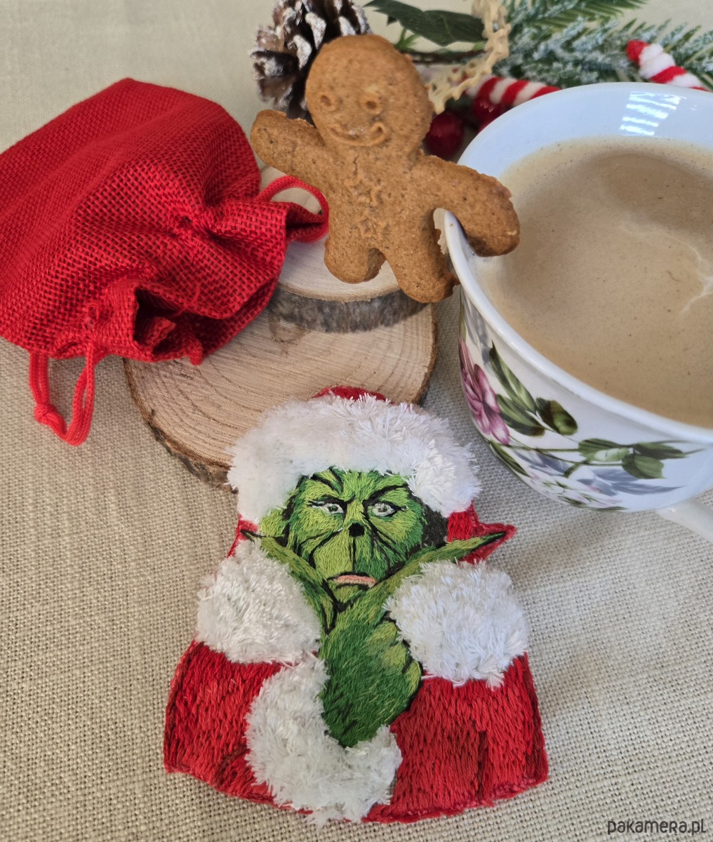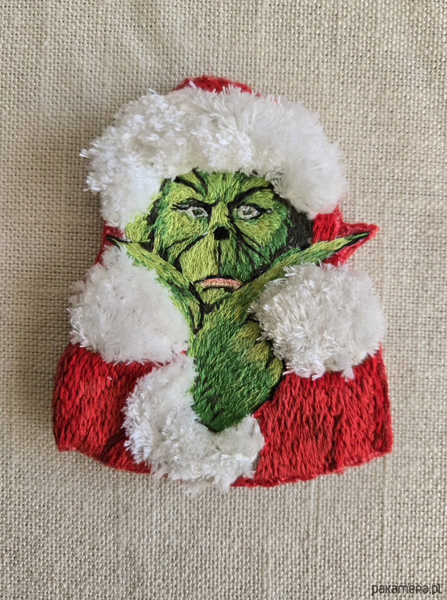 Ręcznie wyszywana broszka przedstawiająca najsłynniejszego świątecznego marudę — Grincha.