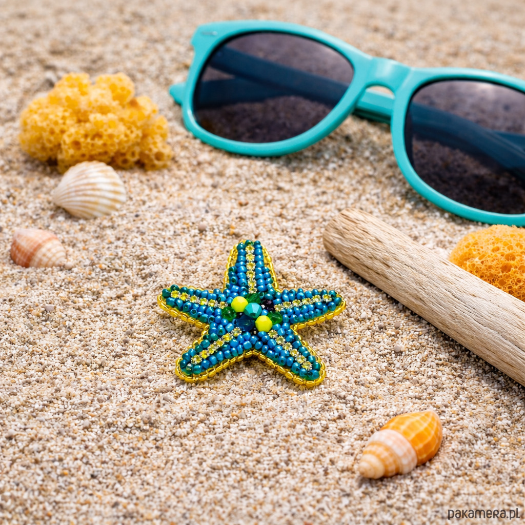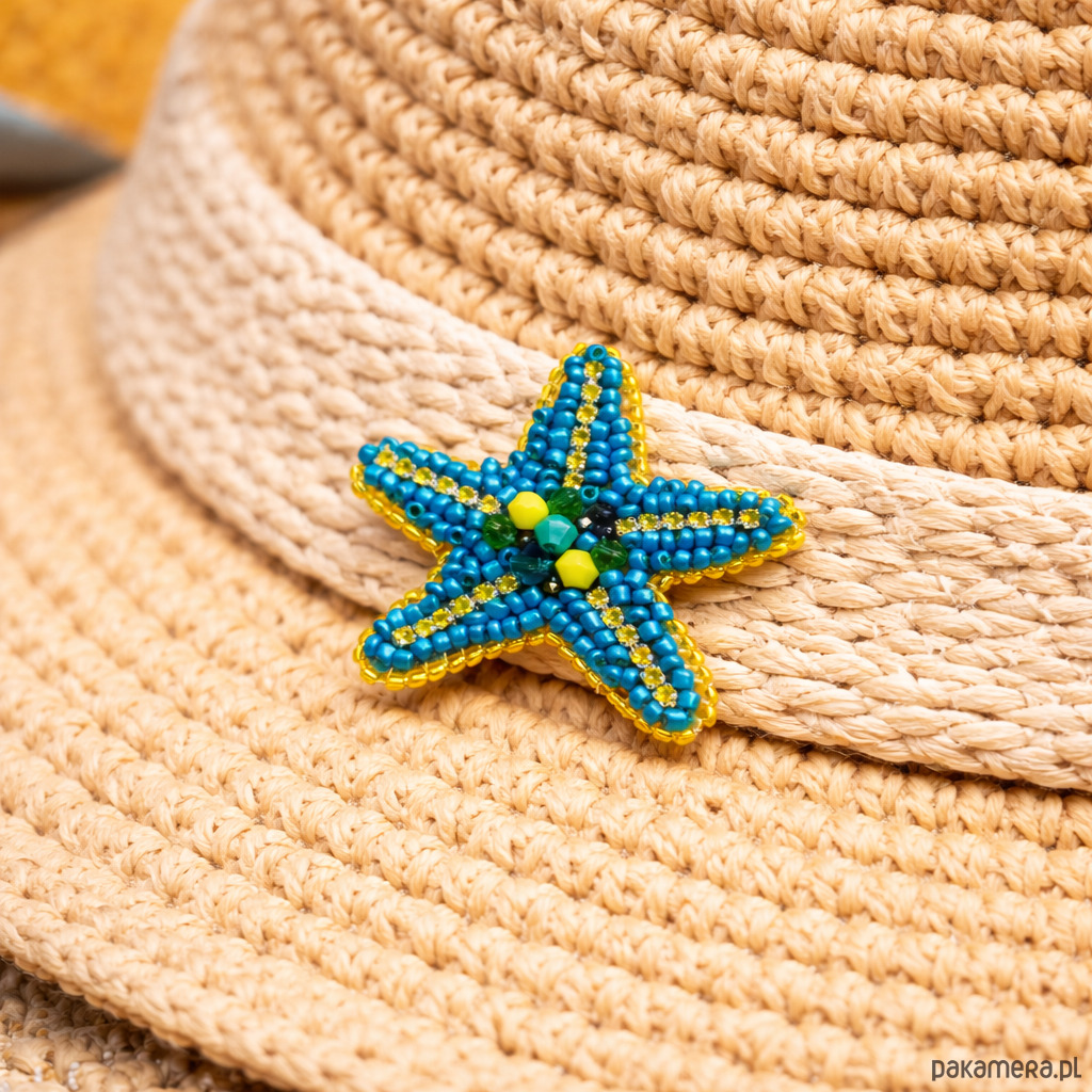 Unikatowa broszka w kształcie rozgwiazdy, wykonana ręcznie z drobnych koralików w odcieniach turkusu, błękitu i słonecznej żółci. Inspirowana latem, morzem i wakacyjną swobodą. Każdy element został starannie doszyty, dzięki czemu broszka pięknie mieni się w świetle i przyciąga wzrok.