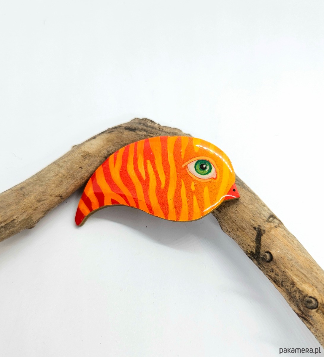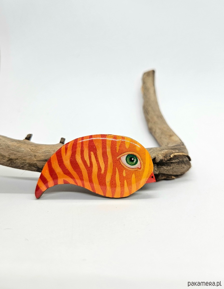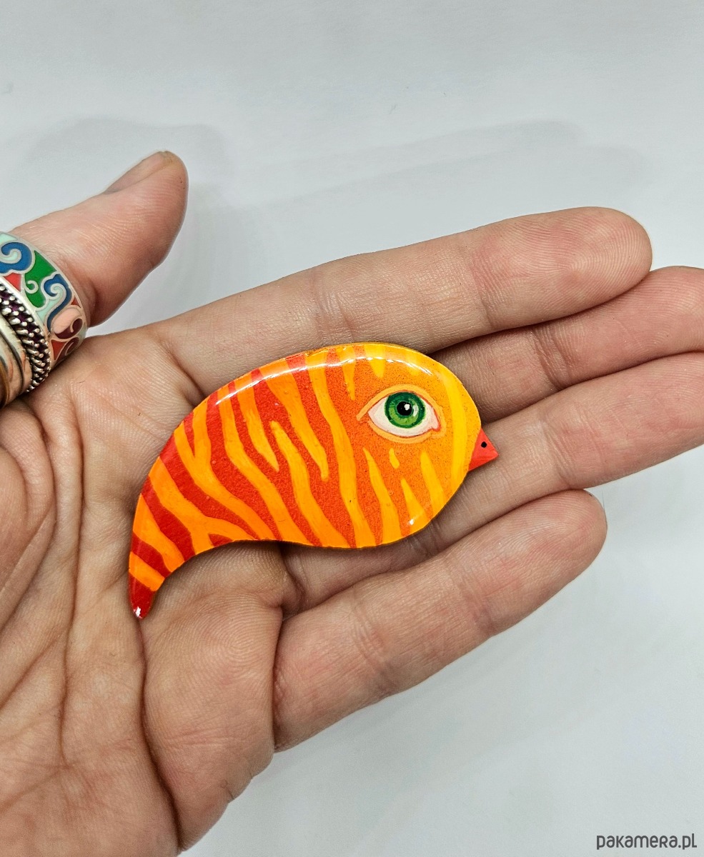 Broszka z drewna , ręcznie malowana, zalana żywicą, wielkość około 6 cm