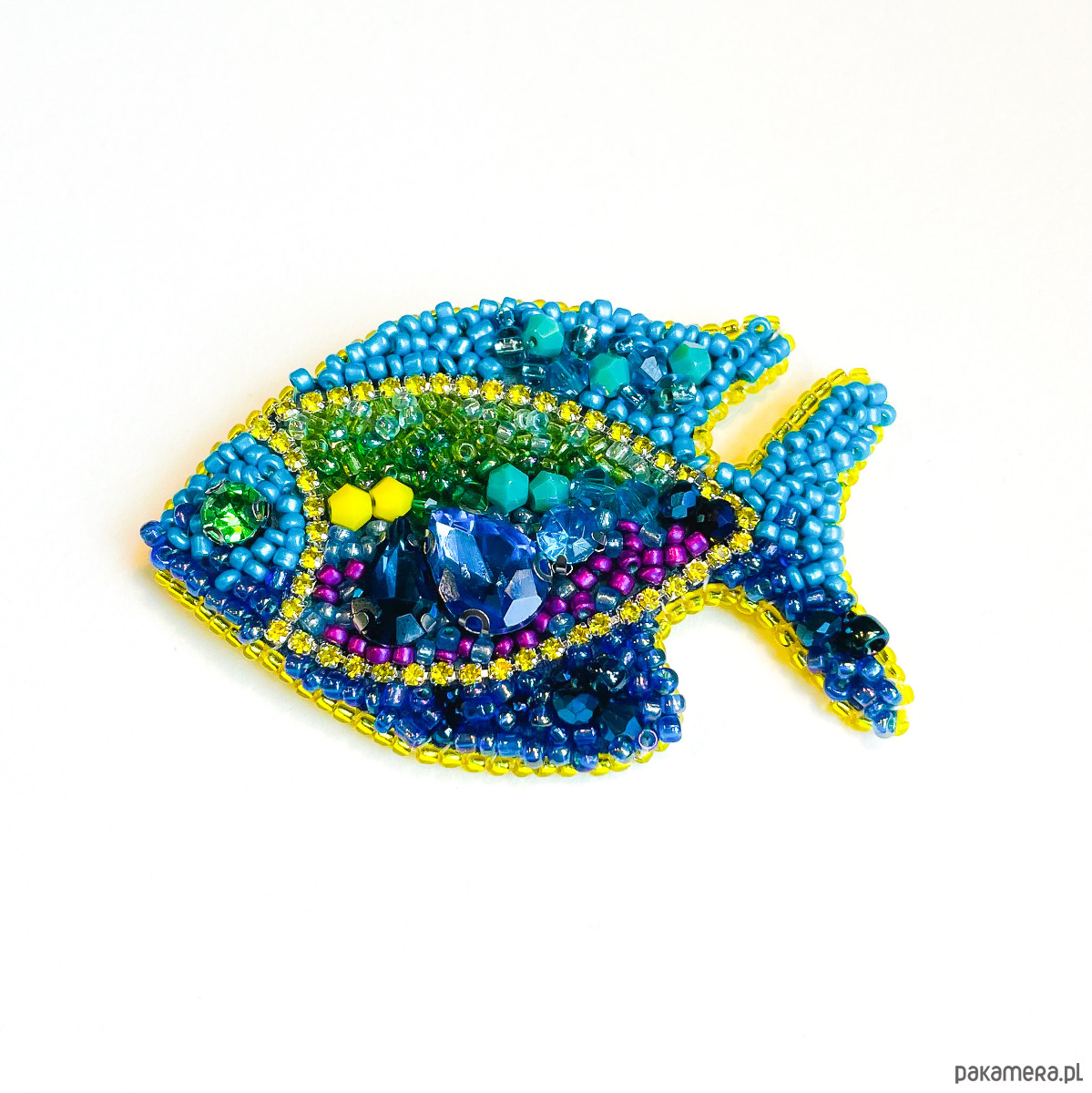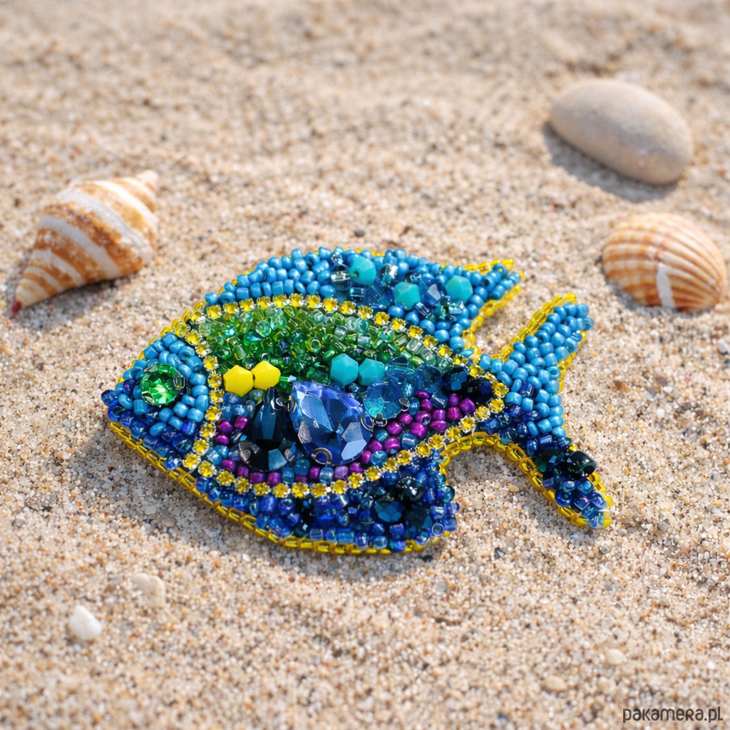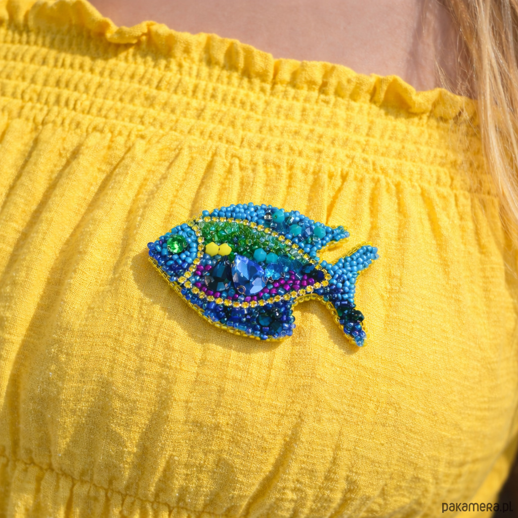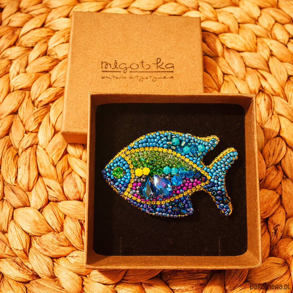 Unikatowa broszka wykonana ręcznie techniką haftu koralikowego. Kolorowa rybka zachwyca bogactwem barw – od odcieni turkusu i błękitu, przez zieleń, aż po słoneczne żółcie i subtelne akcenty fioletu. Starannie dobrane koraliki i kryształki pięknie odbijają światło, nadając broszce biżuteryjnego charakteru.