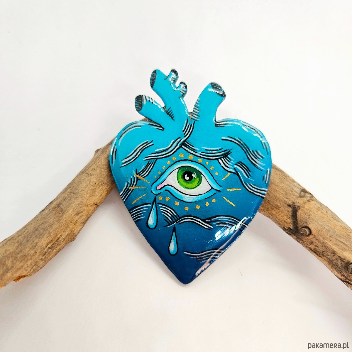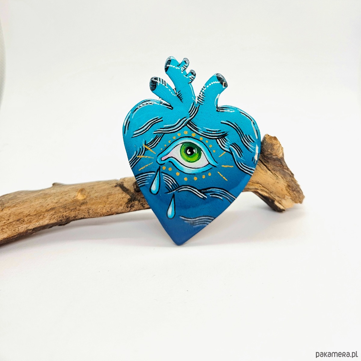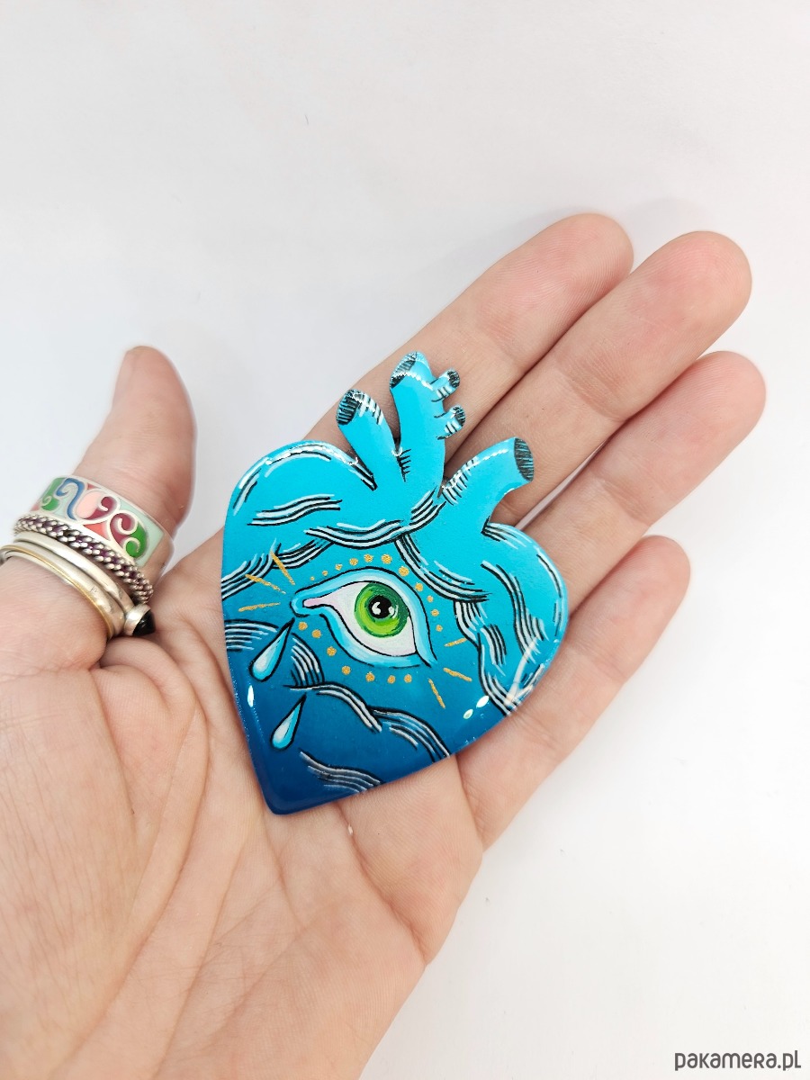 Z drewna , ręcznie malowana nastepnie zalana żywicą, wielkość około 8 cm.