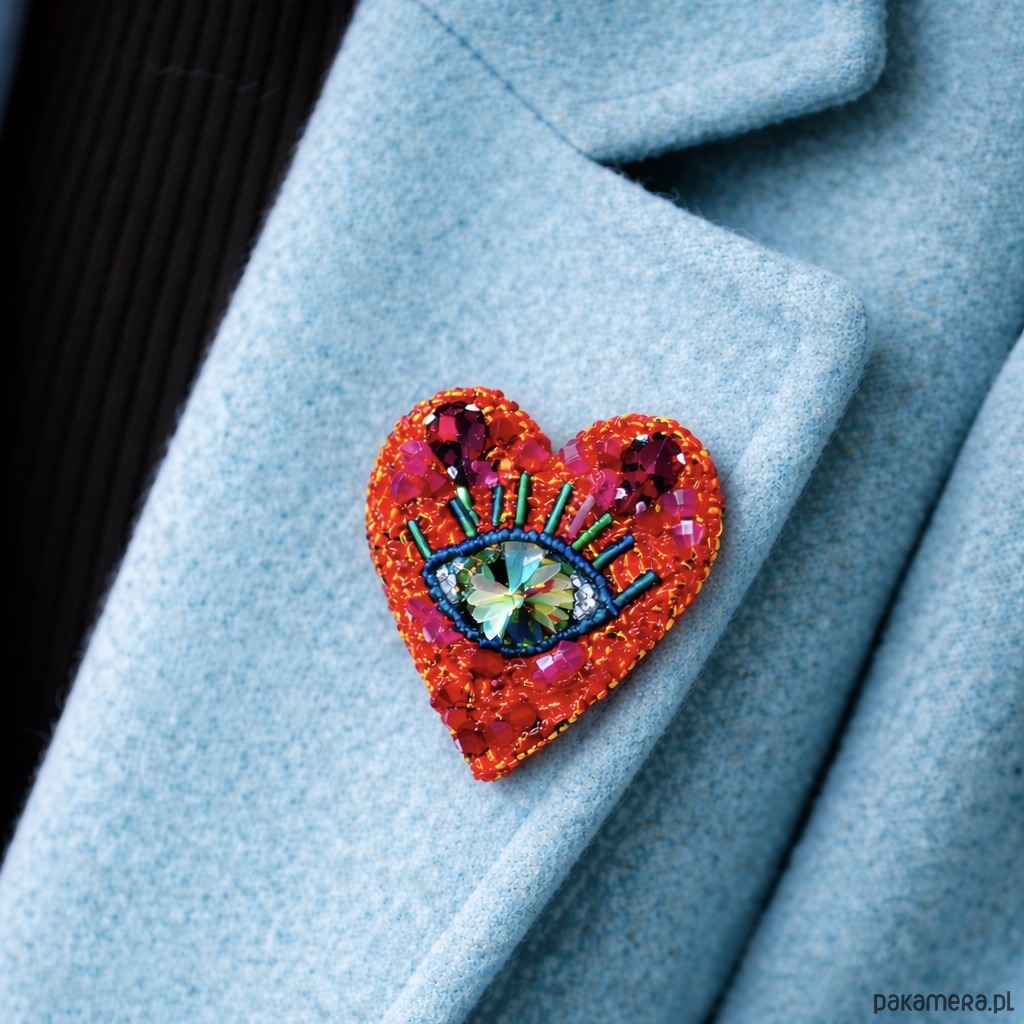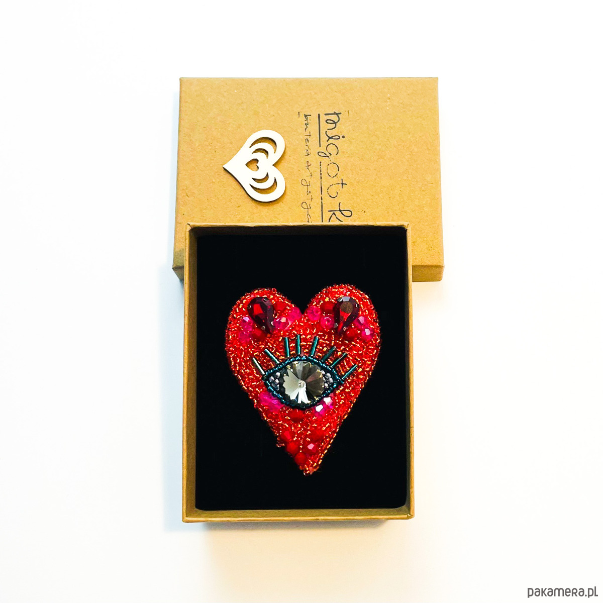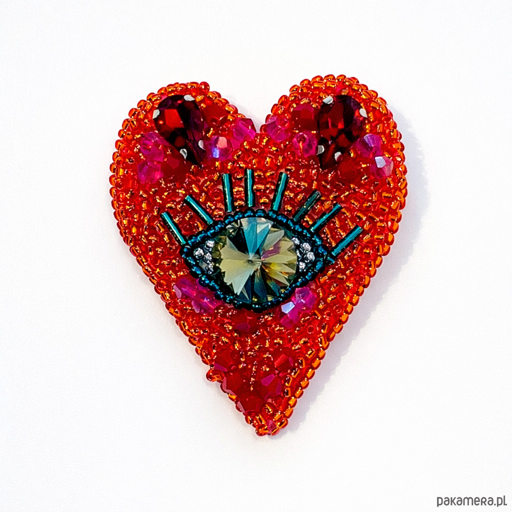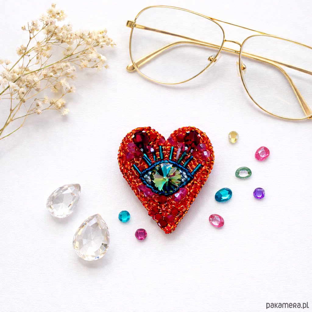 Wyjątkowa broszka wykonana ręcznie techniką haftu koralikowego. Intensywnie czerwone serce wypełnione drobnymi koralikami i kryształkami kryje w sobie symboliczne oko, które przyciąga wzrok wielobarwnym blaskiem. To połączenie miłości, intuicji i ochrony — biżuteria z charakterem i znaczeniem.