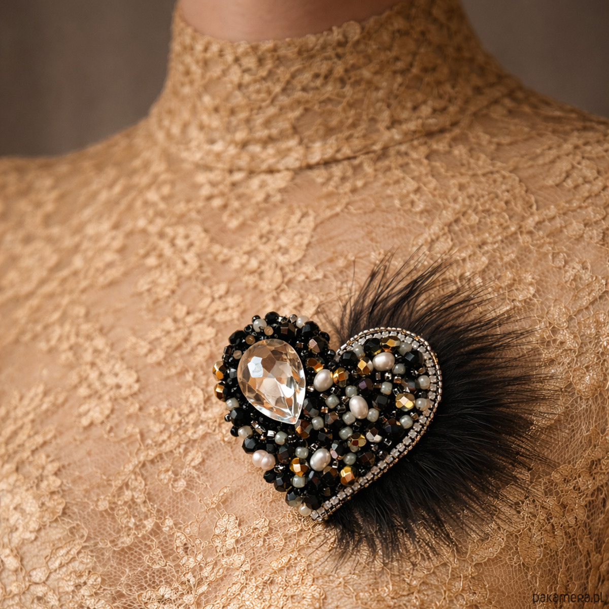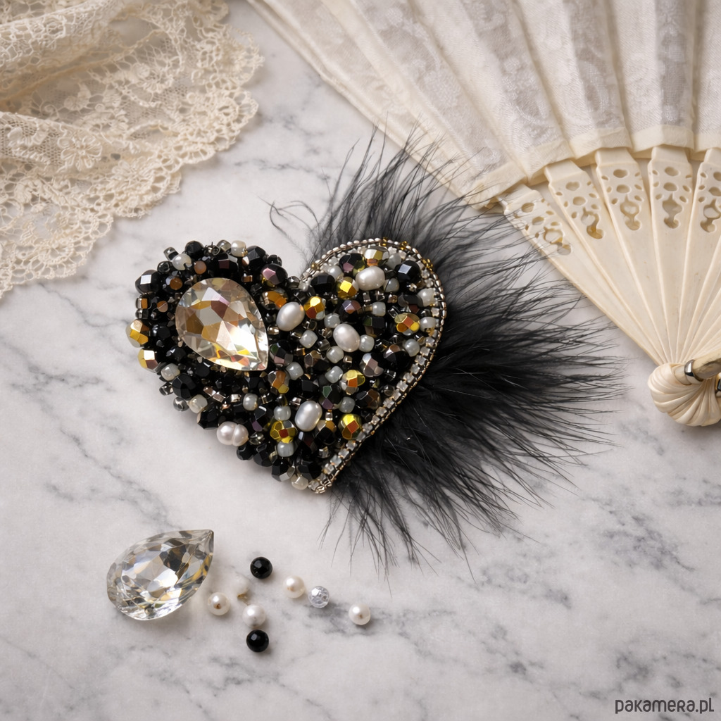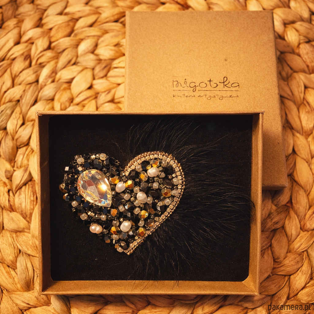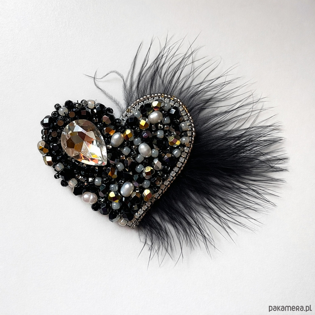 Wyjątkowa, ręcznie wykonana broszka w kształcie serca, stworzona techniką haftu koralikowego. Bogata kompozycja czarnych i złotych koralików, perełek oraz efektownego kryształu w kształcie łezki nadaje jej luksusowego charakteru. Całość dopełniają delikatne czarne pióra, które dodają lekkości i eleganckiej dramaturgii.