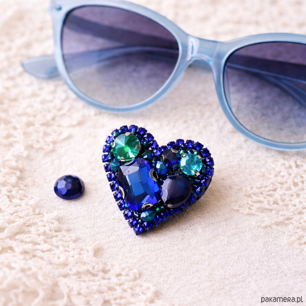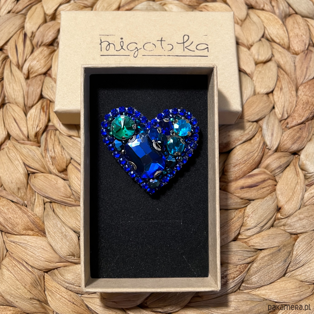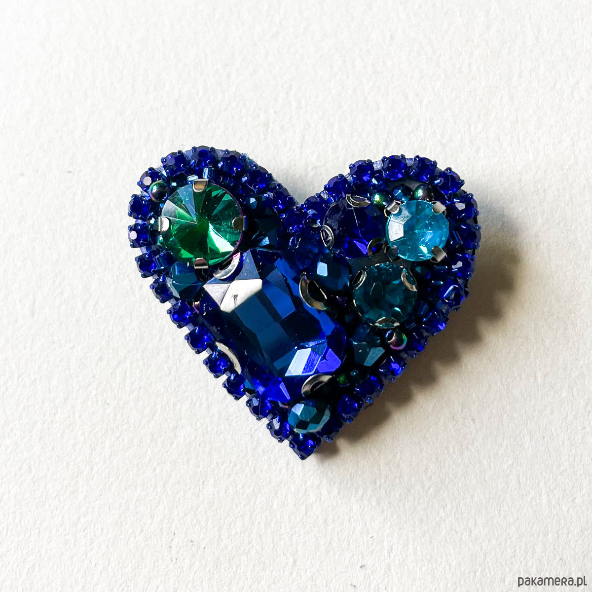Wyjątkowa, ręcznie wykonana broszka w kształcie serca, stworzona w technice haftu koralikowego, z efektownymi kryształami o pięknym połysku, które zmieniają kolor w zależności od światła.