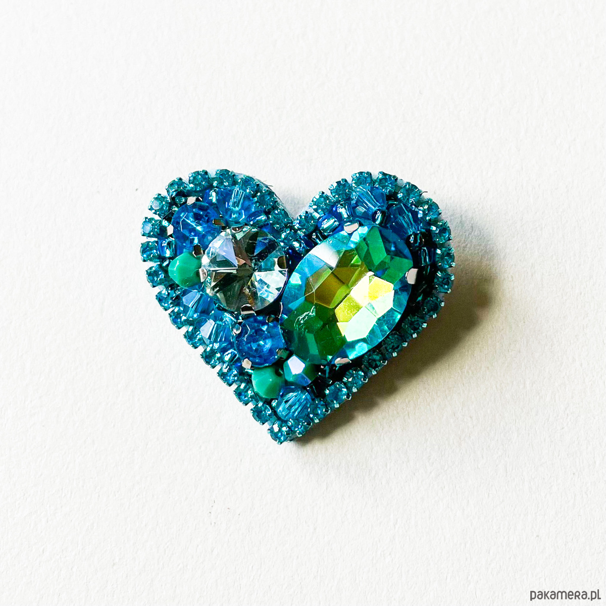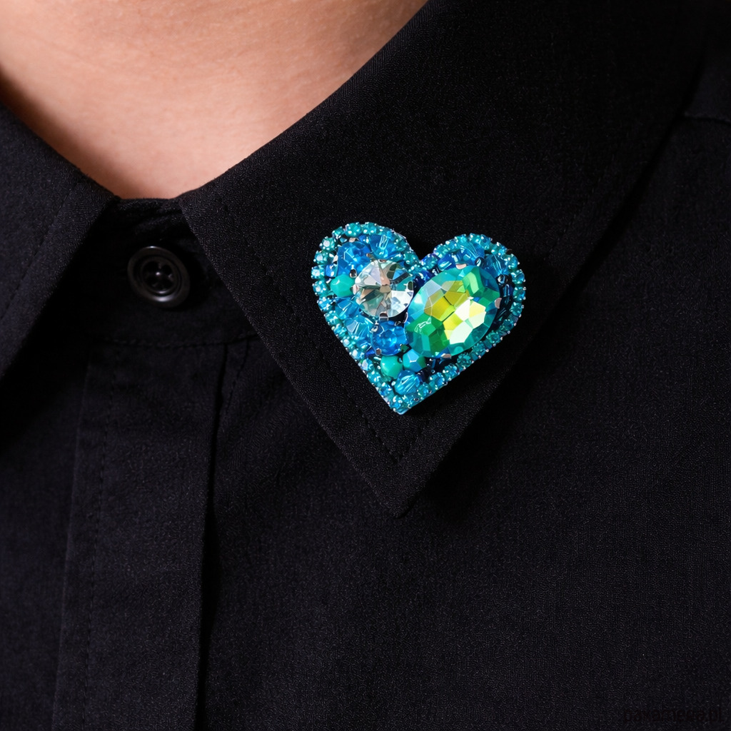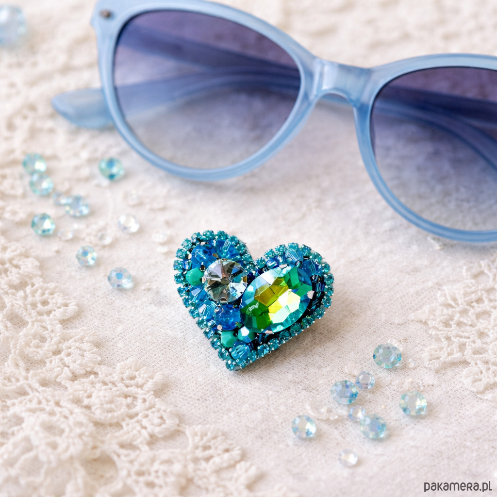 Wyjątkowa, ręcznie wykonana broszka w kształcie serca, stworzona w technice haftu koralikowego, z efektownymi kryształami o pięknym połysku, które zmieniają kolor w zależności od światła.