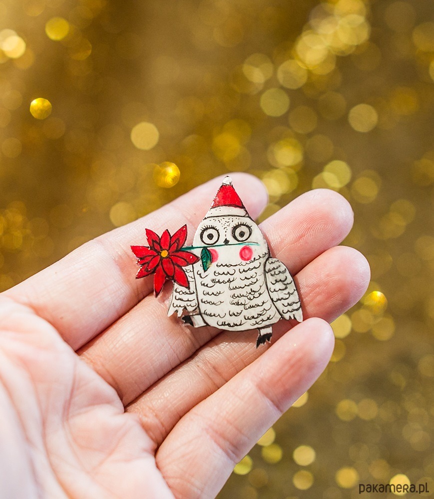 Ta mała, ręcznie rysowana broszka to prawdziwa świąteczna perełka! Urocza sówka w zimowej odsłonie, z kwiatem gwiazdy betlejemskiej i migoczącymi oczkami, doda magii każdej zimowej stylizacji. Jej delikatny design pełen jest ciepła i radości, idealnie wpasowując się w świąteczny klimat. To idealny sposób, by poczuć się jak w bajce – czy to na wigilijnym przyjęciu, czy w codziennych, zimowych spacerach.