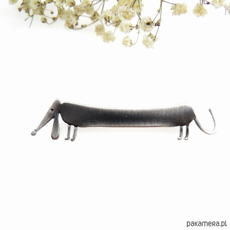 Urocza i zabawna broszka srebrna w postaci wesołego jamnika. Całość została zoksydowana na szary kolor. Długość broszki: 7,5 cm, szerokość: 1,5 cm.