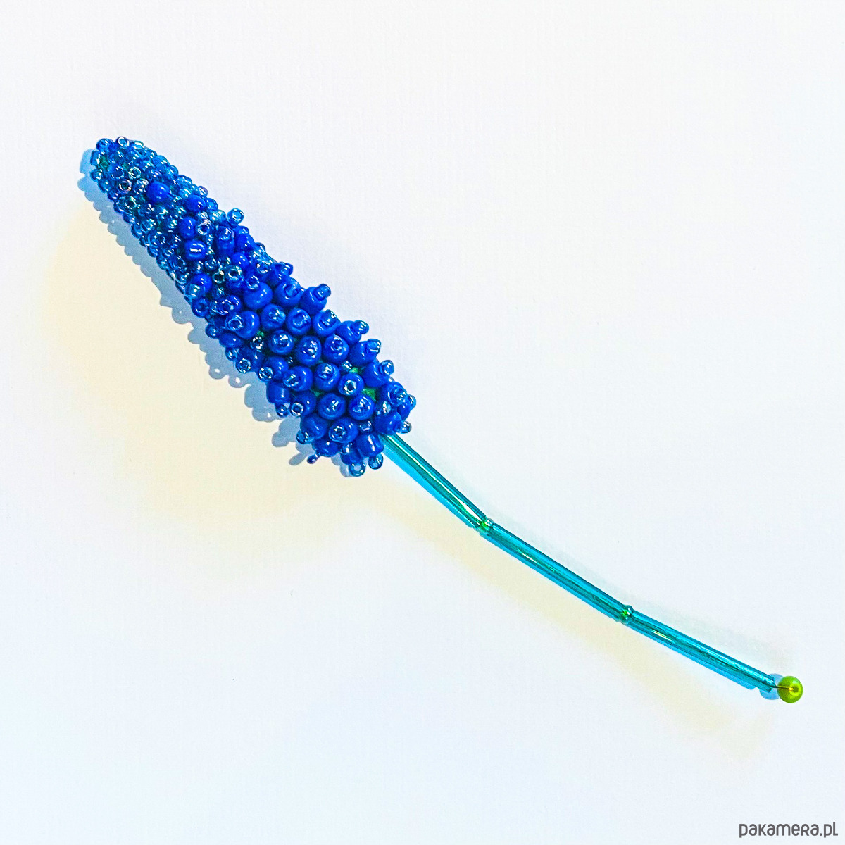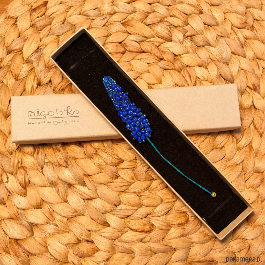 Broszka została misternie uformowana z drobnych, niebieskich koralików, które oddają charakterystyczny kształt i głębię koloru kwiatów szafirka. Smukła forma sprawia, że pięknie prezentuje się na ubraniach, ale także jako ozdoba torebki – szczególnie plecionej, słomianej lub lnianej.