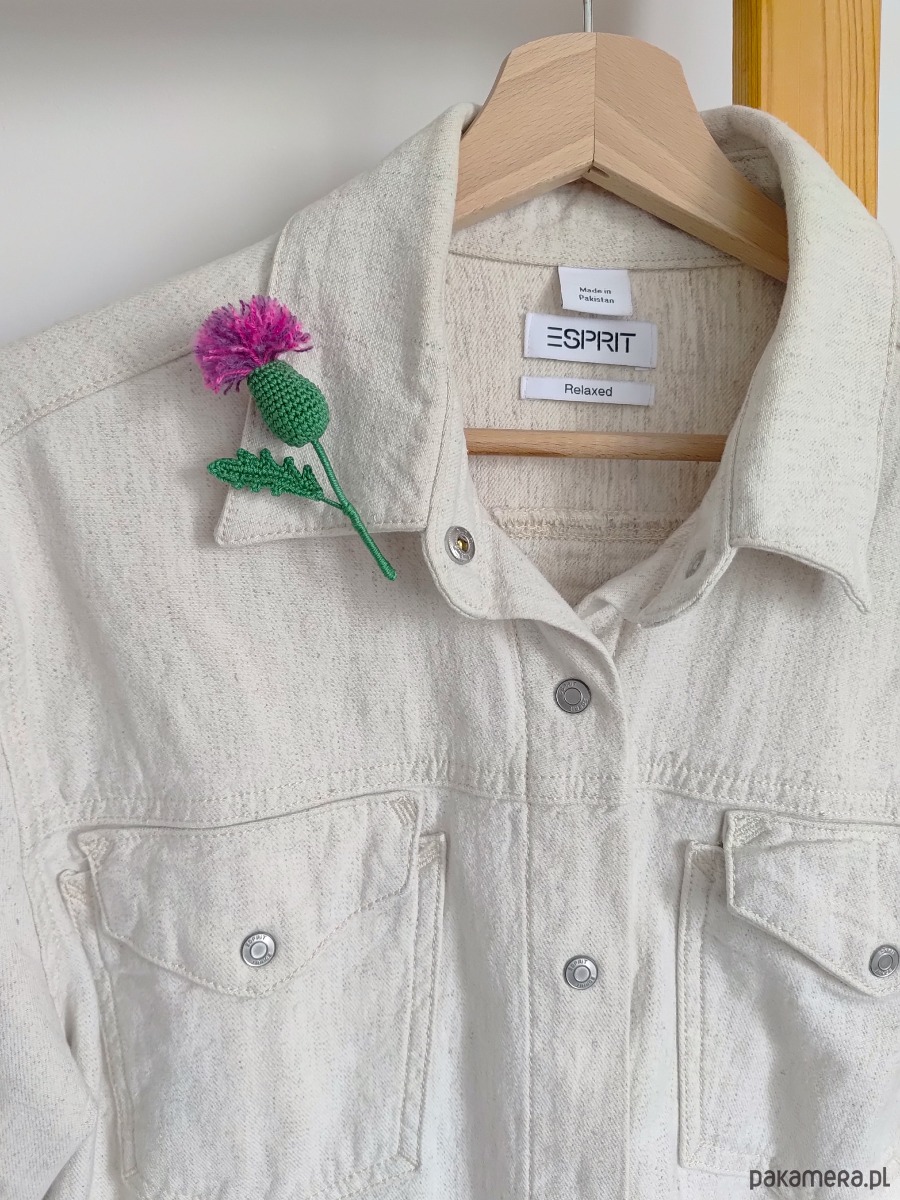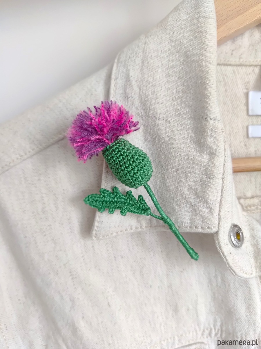 Delikatna broszka w kształcie ostu, wykonana ręcznie na szydełku z cienkich nici, jak mały fragment letniej łąki przeniesiony na ubranie.