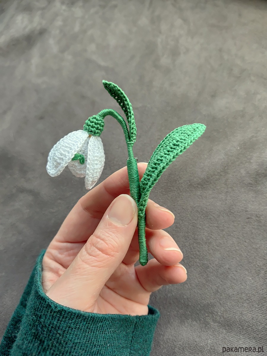 Delikatny przebiśnieg wykonany z nici z merceryzowanej bawełny przy użyciu bardzo cienkiego szydełka 0,9 mm.