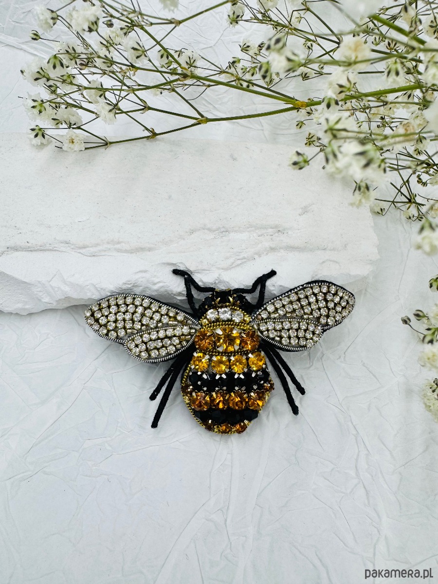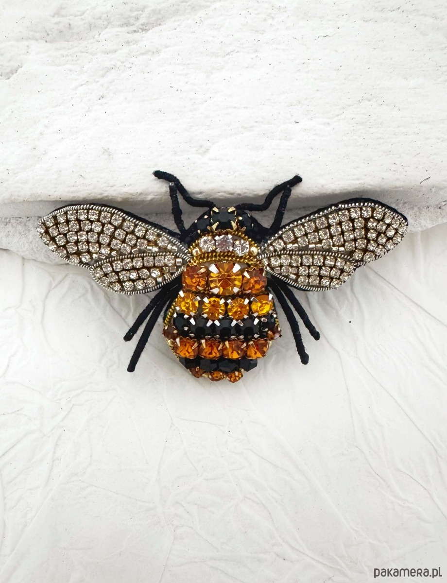Unikalna broszka w kształcie trzmiela, wykonana ręcznie techniką haftu koralikowego. Połączenie złotych, bursztynowych i czarnych kryształków sprawia, że wygląda elegancko i efektownie.