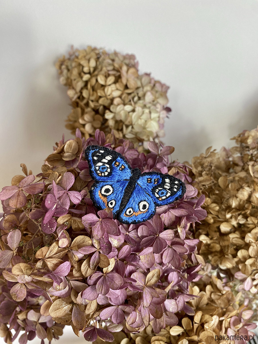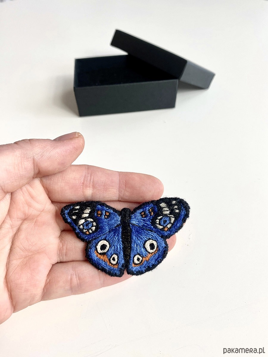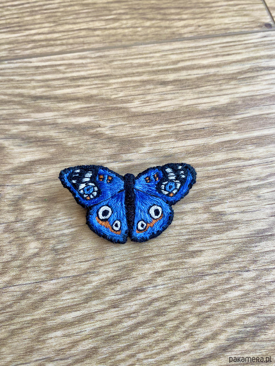 Broszka UNIKAT - ręcznie haftowany, niebieski motyl