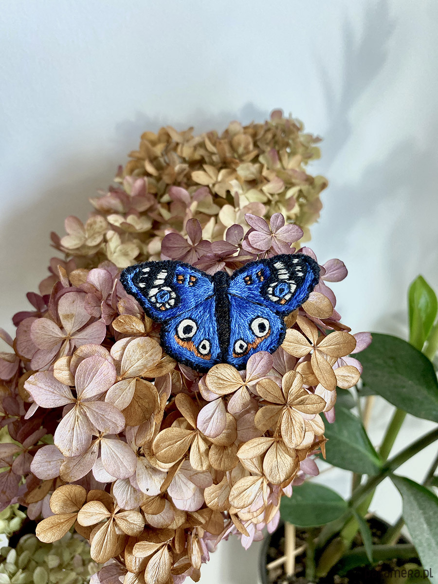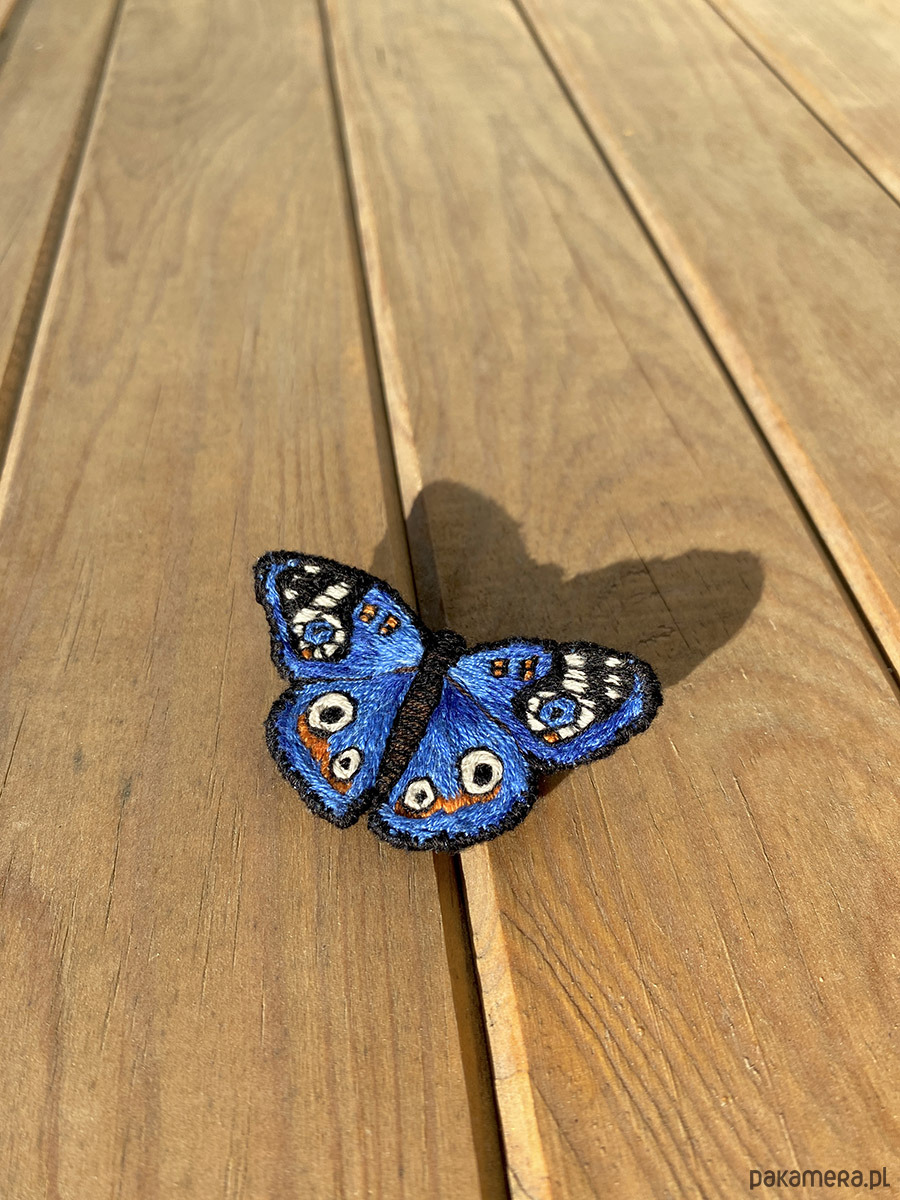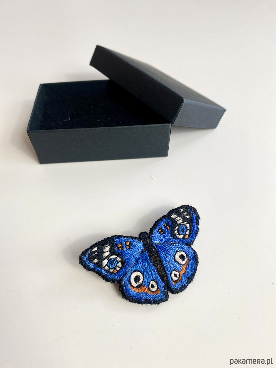 Broszka UNIKAT - ręcznie haftowany, niebieski motyl