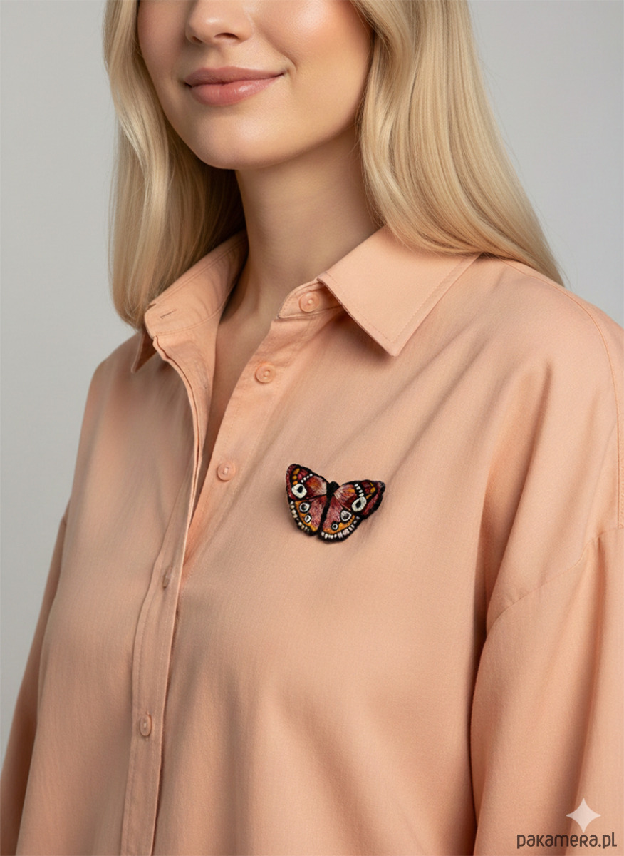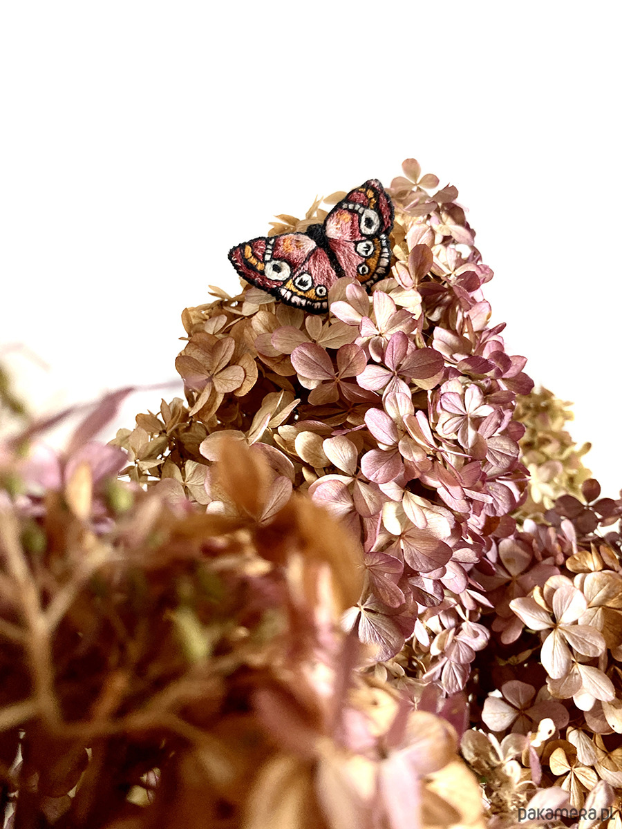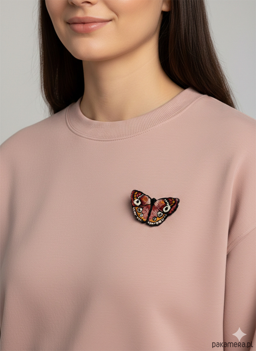 To nie tylko broszka, to miniaturowe dzieło sztuki stworzone haftem ręcznym. Precyzyjne przejścia barw i misterne ściegi oddają aksamitność skrzydeł. To rzemiosło, które tchnie życie w nici.