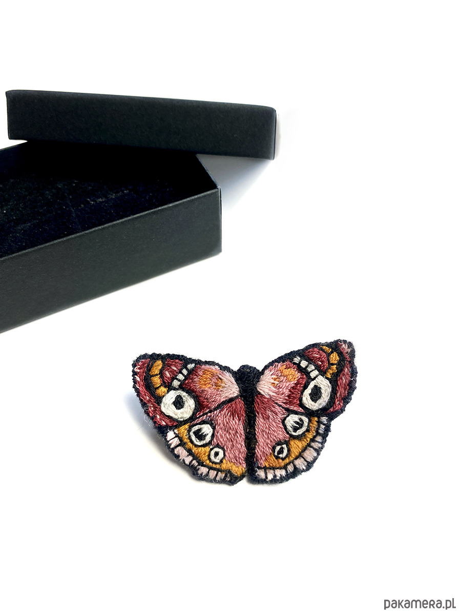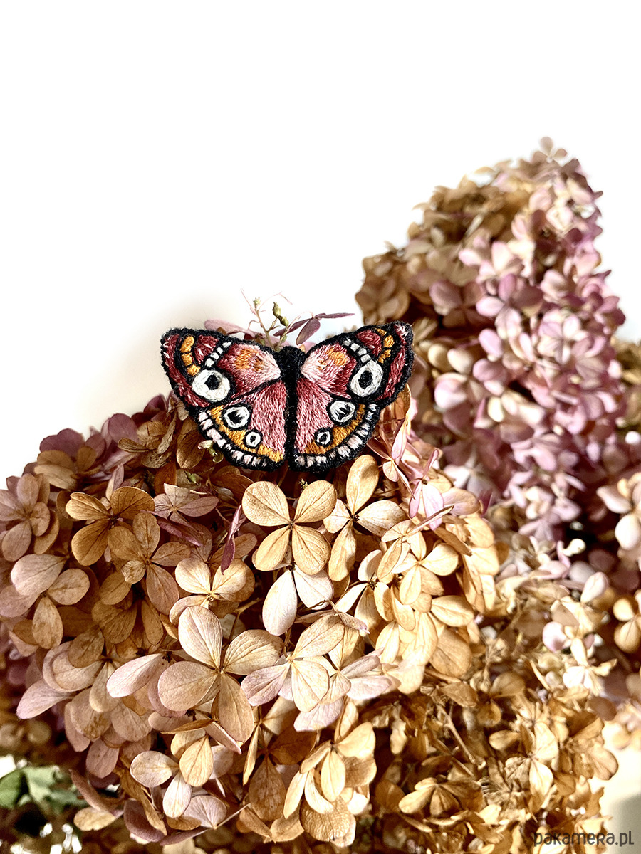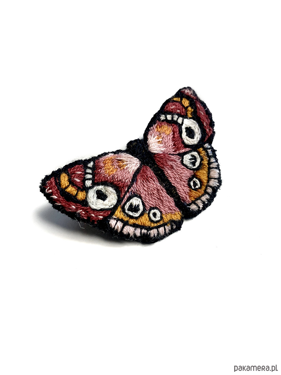 To nie tylko broszka, to miniaturowe dzieło sztuki stworzone haftem ręcznym. Precyzyjne przejścia barw i misterne ściegi oddają aksamitność skrzydeł. To rzemiosło, które tchnie życie w nici.
