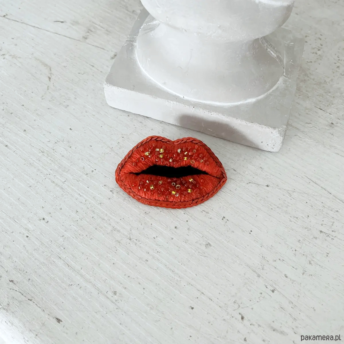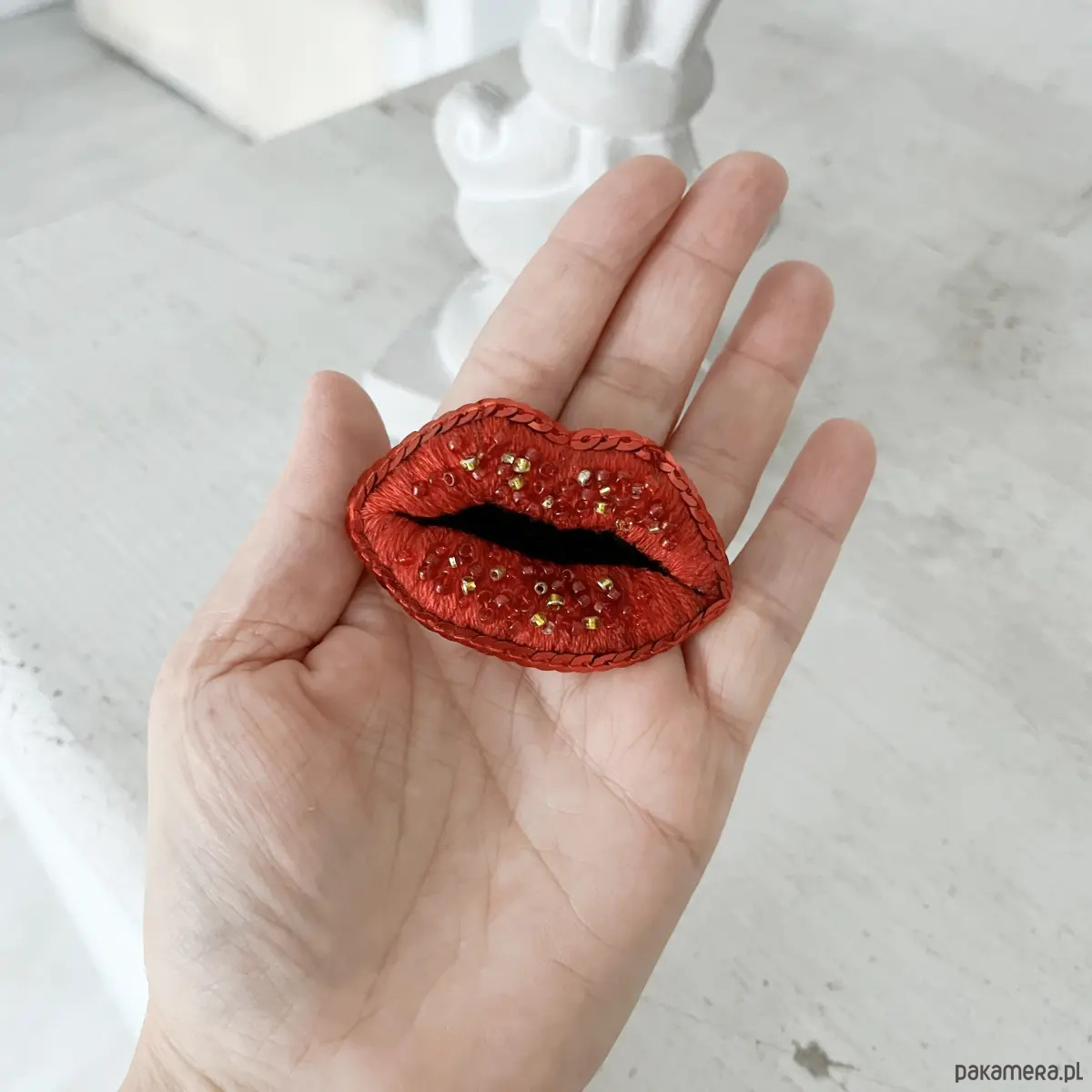 Broszka USTA 6 ręcznie haftowana przypinka koraliki