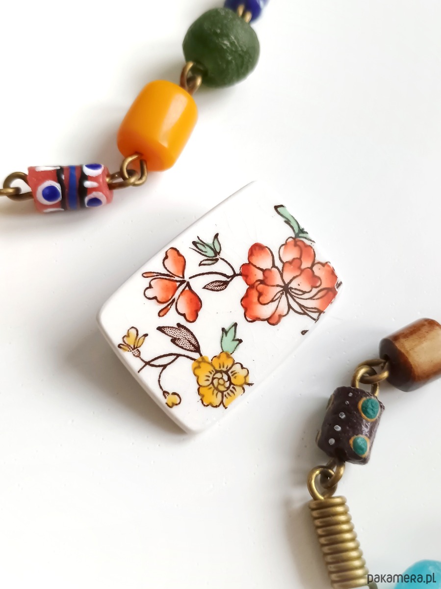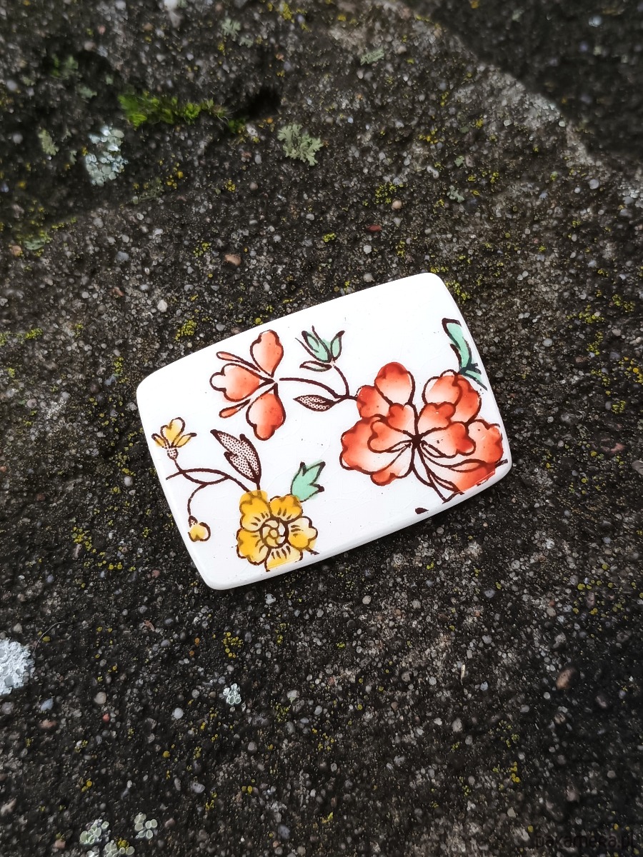 Broszka, którą wykonałam z fragmentu stłuczonego talerza - fajansu angielskiego Copeland Spode. Kawałek stłuczki oszlifowałam w prostokątny kształt i połączyłam z metalowym zapięciem. Ceramikę zeszlifowałam również z grubości, dzięki czemu przypinka nie jest ciężka. Brzegi i tył pokryłam lakierem, co sprawia, że nie brudzą się i nie chłoną wilgoci. Wymiary elementu ceramicznego: 26 x 37 mm. Unikat - każdy z moich wyrobów występuje w jednym egzemplarzu. Upcykling - nie reprodukuję wykorzystywanych wzorów, niczego nie domalowuję - wykorzystuję wyłącznie oryginalne naczynia i motywy, które się na nich znajdują. Tym samym, stłuczce z odzysku nadaję nowe życie.