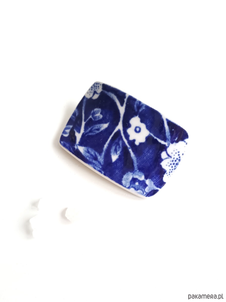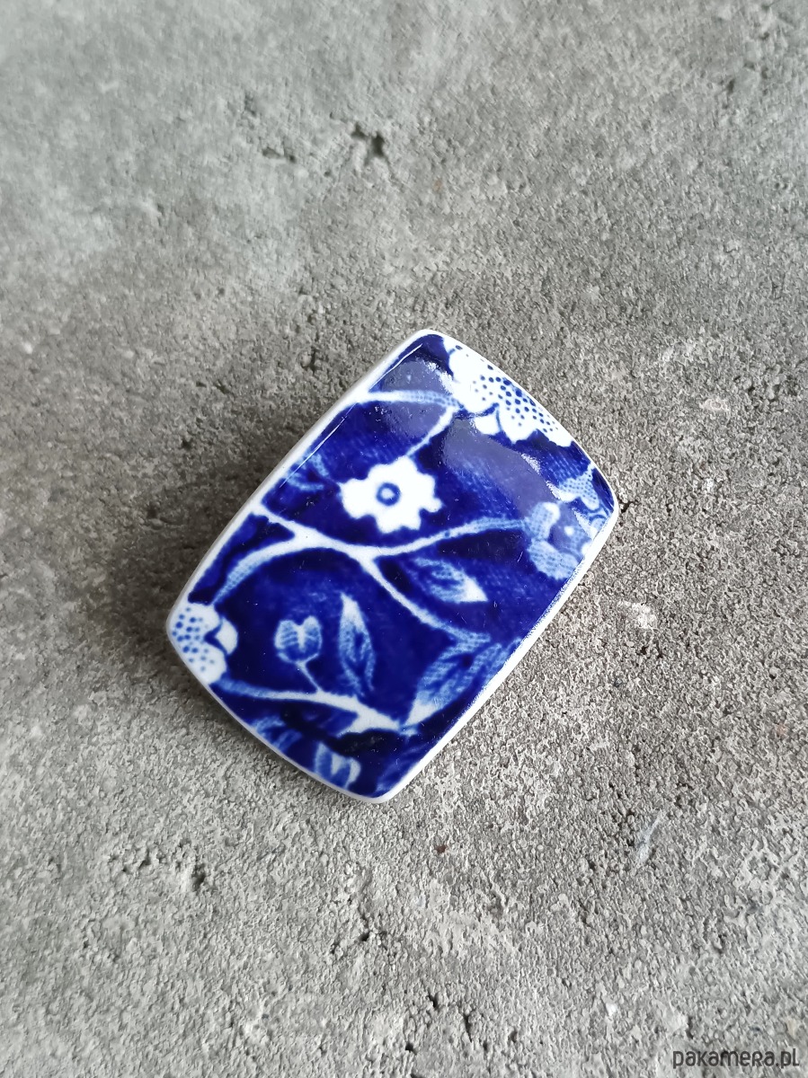 Nieduża broszka, którą wykonałam z fragmentu stłuczonego talerza z fajansu angielskiego z kobaltowym motywem kwiatowym. Kawałek stłuczki oszlifowałam w prostokątny kształt i połączyłam z metalowym zapięciem. Ceramikę zeszlifowałam również z grubości - jest cieńsza niż pierwotnie, dzięki czemu przypinka nie jest ciężka. Brzegi i tył pokryłam lakierem, co sprawia, że nie brudzą się i nie chłoną wilgoci. Wymiary elementu ceramicznego: 25 x 35 mm. Unikat - każdy z moich wyrobów występuje w jednym egzemplarzu. Upcykling - nie reprodukuję wykorzystywanych wzorów, niczego nie domalowuję - wykorzystuję wyłącznie oryginalne naczynia i motywy, które się na nich znajdują. Tym samym, stłuczce z odzysku nadaję nowe życie.