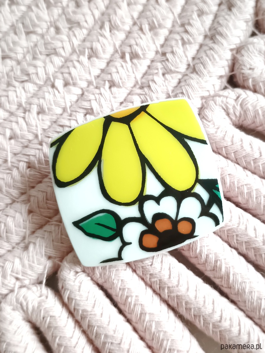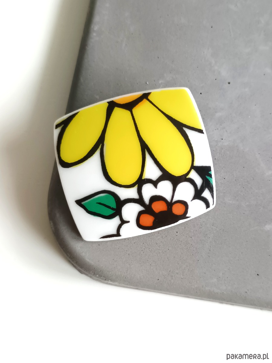 Oryginalna broszka, którą wykonałam z fragmentu stłuczonego wazonu w kolorowe kwiaty. Kawałek stłuczki oszlifowałam w prostokątny kształt i połączyłam z metalowym zapięciem. Ceramikę zeszlifowałam również z grubości - jest cieńsza niż pierwotnie, dzięki czemu przypinka nie jest ciężka. Brzegi i tył pokryłam lakierem, co sprawia, że nie brudzą się i nie chłoną wilgoci. Wymiary elementu ceramicznego: 31 x 34 mm. Unikat - każdy z moich wyrobów występuje w jednym egzemplarzu. Upcykling - nie reprodukuję wykorzystywanych wzorów, niczego nie domalowuję - wykorzystuję wyłącznie oryginalne naczynia i motywy, które się na nich znajdują. Tym samym, stłuczce z odzysku nadaję nowe życie.