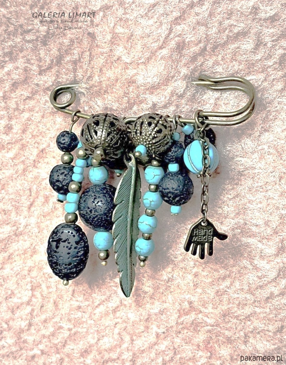Autorska ręcznie robiona broszka w bardzo modnym stylu BOHO. Ozdobne elementy z howlitu turkusowego, lawy wulkanicznej i mosiądzu, zostały nanizane na wielką agrafę. Ta wielka agrafa to bardzo efektowna ozdoba.