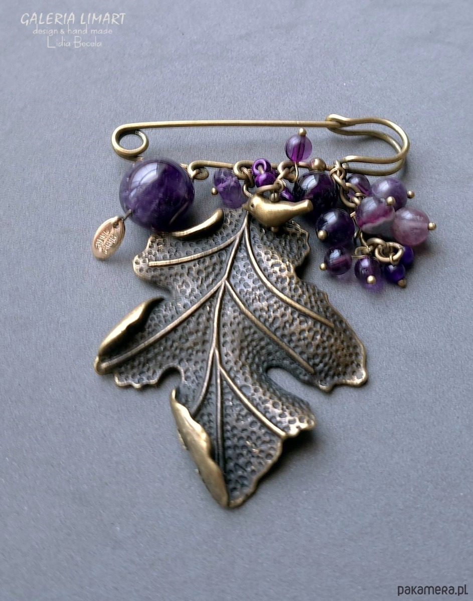 Autorska kompozycja utrzymana w bardzo modnym stylu BOHO. Efektowny dorodny liść z mosiądzu ozdobiony "gronem" z ametystów i uroczym malutkim ptaszkiem, został zawieszony na wielkiej mosiężnej agrafie.
