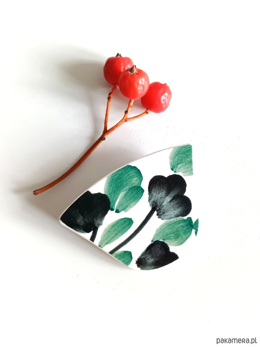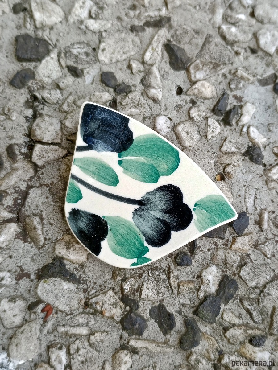 Historia fajansu włocławskiego sięga 1873 roku. Zakładów było kilka, zmieniali się właściciele i lokalizacje. Produkcja najbardziej rozwinęła się po II WŚ, kiedy w miejscowych zakładach powstawał nie tylko fajans, ale również porcelit i porcelana. Zróżnicowane było także wzornictwo - produkowano nie tylko naczynia, ale również elementy wyposażenia wnętrz (lampy, świeczniki, żyrandole). Mimo tej różnorodności, najbardziej rozpoznawalnym wyrobem z Włocławka jest talerz w ręcznie malowane kobaltowe kwiaty (z takich najchętniej korzystam :). I mimo, że najdłużej działająca fabryka zakończyła działalność w 1991 roku, dzięki lokalnym inicjatywom produkcja fajansu została wznowiona i trwa do dziś! Oto broszka, którą wykonałam z fragmentu fajansu włocławskiego, ręcznie malowanego w kolorowe wzory. Kawałek stłuczki oszlifowałam w opływowy kształt i połączyłam z metalowym zapięciem. Ceramikę zeszlifowałam również z grubości, dzięki czemu broszka nie jest masywna. Brzegi i tył pokryłam lakierem, co sprawia, że nie brudzą się i nie chłoną wilgoci. Wymiary elementu ceramicznego: 34 x 49 mm. Unikat - każdy z moich wyrobów występuje w jednym egzemplarzu. Upcykling - nie reprodukuję wykorzystywanych wzorów, niczego nie domalowuję - wykorzystuję wyłącznie oryginalne naczynia i motywy, które się na nich znajdują. Tym samym, stłuczce z odzysku nadaję nowe życie.