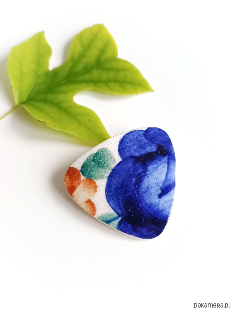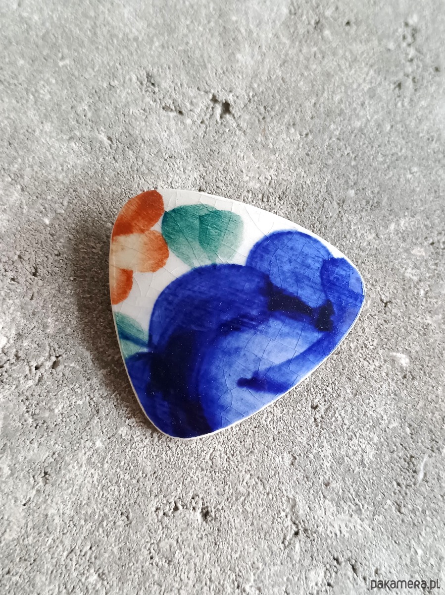 Historia fajansu włocławskiego sięga 1873 roku. Zakładów było kilka, zmieniali się właściciele i lokalizacje. Produkcja najbardziej rozwinęła się po II WŚ, kiedy w miejscowych zakładach powstawał nie tylko fajans, ale również porcelit i porcelana. Zróżnicowane było także wzornictwo - produkowano nie tylko naczynia, ale również elementy wyposażenia wnętrz (lampy, świeczniki, żyrandole). Mimo tej różnorodności, najbardziej rozpoznawalnym wyrobem z Włocławka jest talerz w ręcznie malowane kobaltowe kwiaty (z takich najchętniej korzystam :). I mimo, że najdłużej działająca fabryka zakończyła działalność w 1991 roku, dzięki lokalnym inicjatywom produkcja fajansu została wznowiona i trwa do dziś! Oto broszka, którą wykonałam z fragmentu fajansu włocławskiego, ręcznie malowanego w kolorowe wzory. Kawałek stłuczki oszlifowałam w opływowy trójkątny kształt i połączyłam z metalowym zapięciem. Ceramikę zeszlifowałam również z grubości, dzięki czemu broszka nie jest masywna. Brzegi i tył pokryłam lakierem, co sprawia, że nie brudzą się i nie chłoną wilgoci. Wymiary elementu ceramicznego: 38 x 41 mm. Unikat - każdy z moich wyrobów występuje w jednym egzemplarzu. Upcykling - nie reprodukuję wykorzystywanych wzorów, niczego nie domalowuję - wykorzystuję wyłącznie oryginalne naczynia i motywy, które się na nich znajdują. Tym samym, stłuczce z odzysku nadaję nowe życie.