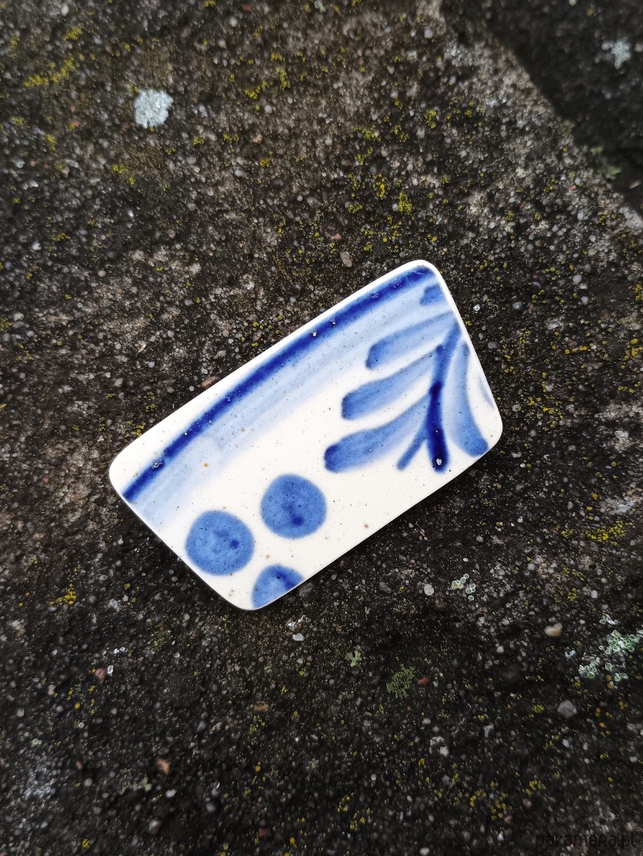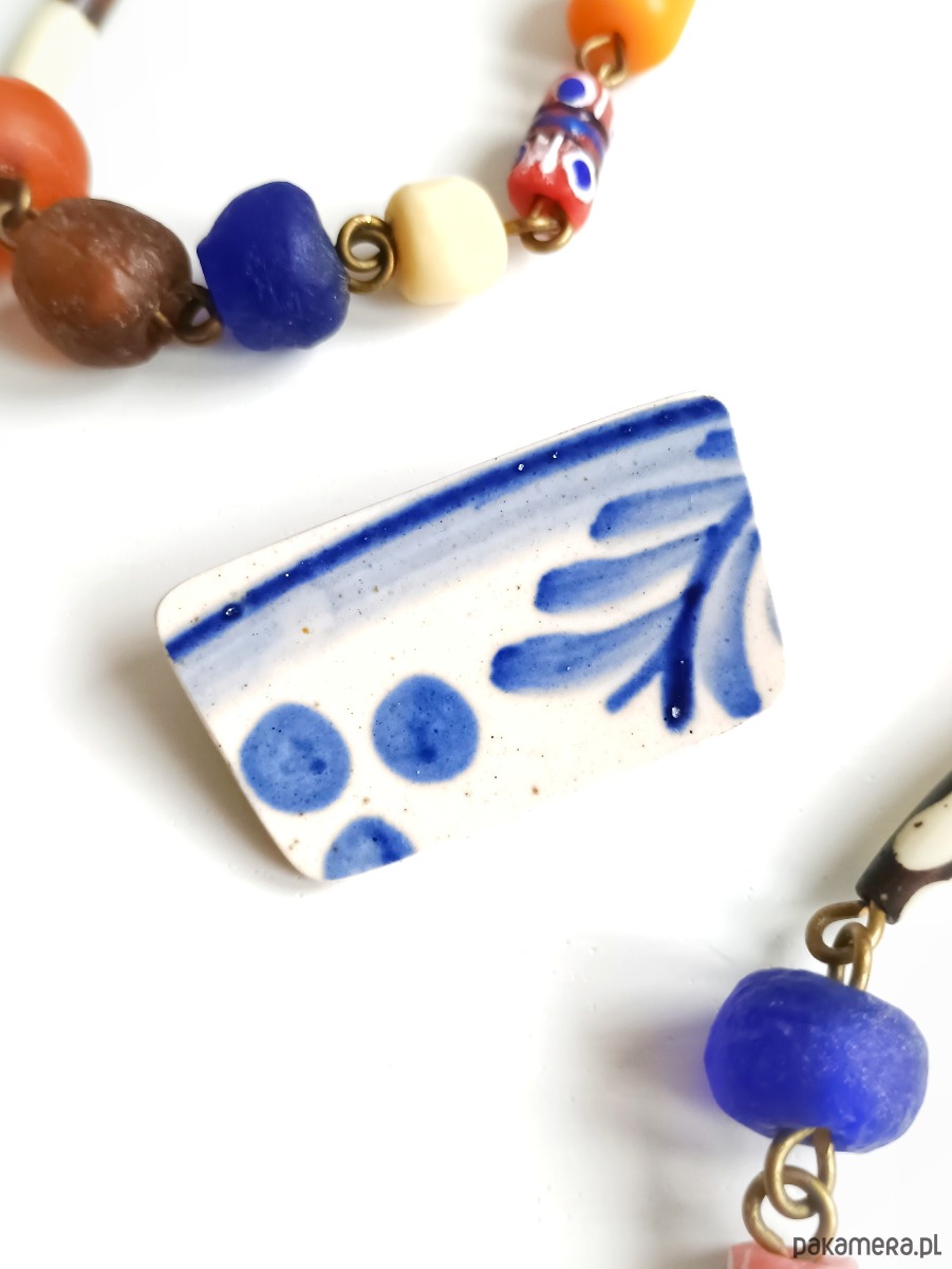 Historia fajansu włocławskiego sięga 1873 roku. Zakładów było kilka, zmieniali się właściciele i lokalizacje. Produkcja najbardziej rozwinęła się po II WŚ, kiedy w miejscowych zakładach powstawał nie tylko fajans, ale również porcelit i porcelana. Zróżnicowane było także wzornictwo - produkowano nie tylko naczynia, ale również elementy wyposażenia wnętrz (lampy, świeczniki, żyrandole). Mimo tej różnorodności, najbardziej rozpoznawalnym wyrobem z Włocławka jest talerz w ręcznie malowane kobaltowe kwiaty (z takich najchętniej korzystam :). I mimo, że najdłużej działająca fabryka zakończyła działalność w 1991 roku, dzięki lokalnym inicjatywom produkcja fajansu została wznowiona i trwa do dziś! Oto broszka, którą wykonałam z fragmentu fajansu włocławskiego, ręcznie malowanego w kobaltowe wzory. Kawałek stłuczki oszlifowałam w opływowy prostokątny kształt i połączyłam z metalowym zapięciem. Ceramikę zeszlifowałam również z grubości, dzięki czemu broszka nie jest masywna. Brzegi pokryłam lakierem, co sprawia, że nie brudzą się i nie chłoną wilgoci. Wymiary elementu ceramicznego: 26 x 46 mm. Unikat - każdy z moich wyrobów występuje w jednym egzemplarzu. Upcykling - nie reprodukuję wykorzystywanych wzorów, niczego nie domalowuję - wykorzystuję wyłącznie oryginalne naczynia i motywy, które się na nich znajdują. Tym samym, stłuczce z odzysku nadaję nowe życie.