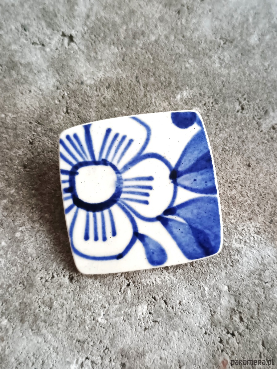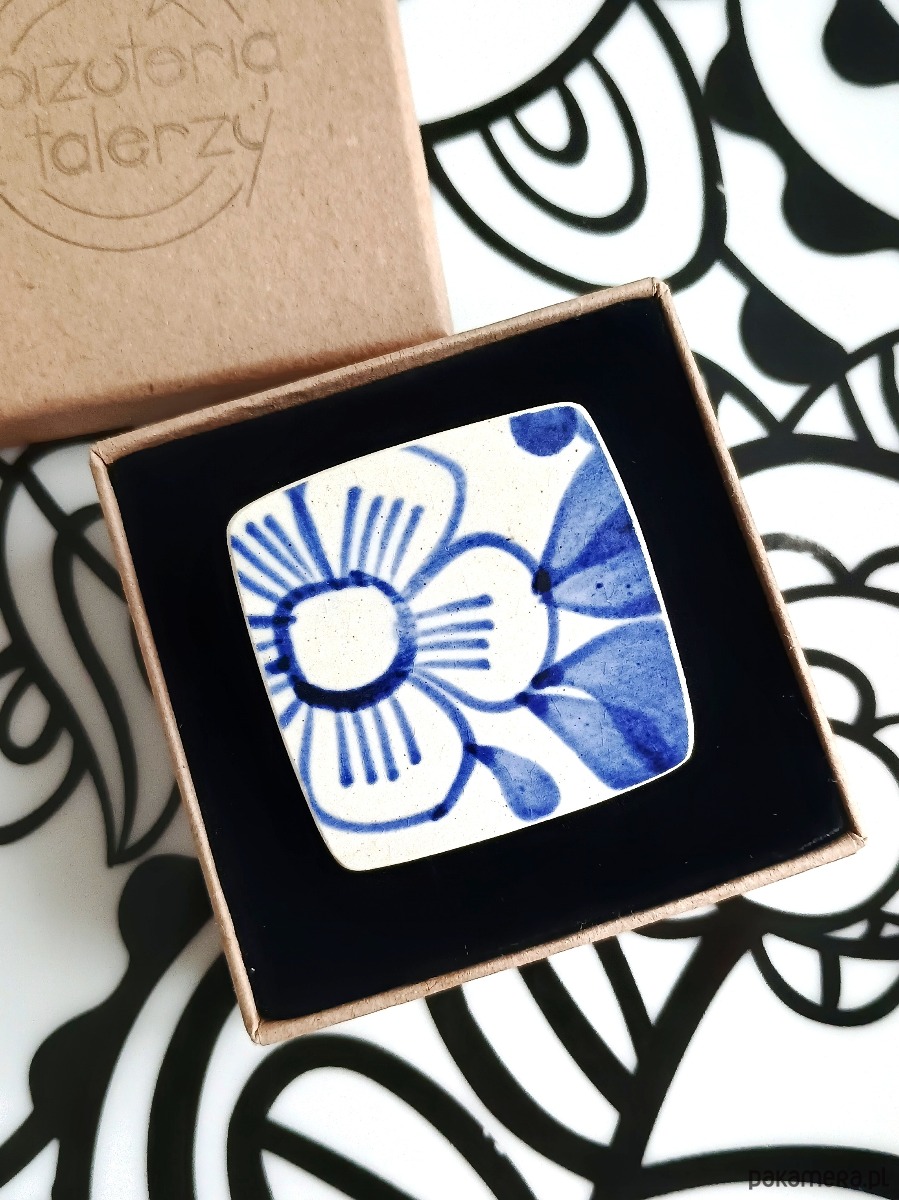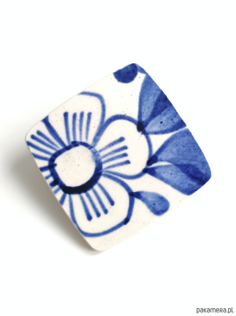 Historia fajansu włocławskiego sięga 1873 roku. Zakładów było kilka, zmieniali się właściciele i lokalizacje. Produkcja najbardziej rozwinęła się po II WŚ, kiedy w miejscowych zakładach powstawał nie tylko fajans, ale również porcelit i porcelana. Zróżnicowane było także wzornictwo - produkowano nie tylko naczynia, ale również elementy wyposażenia wnętrz (lampy, świeczniki, żyrandole). Mimo tej różnorodności, najbardziej rozpoznawalnym wyrobem z Włocławka jest talerz w ręcznie malowane kobaltowe kwiaty (z takich najchętniej korzystam :). I mimo, że najdłużej działająca fabryka zakończyła działalność w 1991 roku, dzięki lokalnym inicjatywom produkcja fajansu została wznowiona i trwa do dziś! Oto broszka, którą wykonałam z fragmentu fajansu włocławskiego, ręcznie malowanego w kobaltowe kwiaty. Kawałek stłuczki oszlifowałam w kwadratowy kształt i połączyłam z metalowym zapięciem. Ceramikę zeszlifowałam również z grubości, dzięki czemu broszka nie jest masywna. Brzegi pokryłam lakierem, co sprawia, że nie brudzą się i nie chłoną wilgoci. Wymiary elementu ceramicznego: 38 x 38 mm. Unikat - każdy z moich wyrobów występuje w jednym egzemplarzu. Upcykling - nie reprodukuję wykorzystywanych wzorów, niczego nie domalowuję - wykorzystuję wyłącznie oryginalne naczynia i motywy, które się na nich znajdują. Tym samym, stłuczce z odzysku nadaję nowe życie.