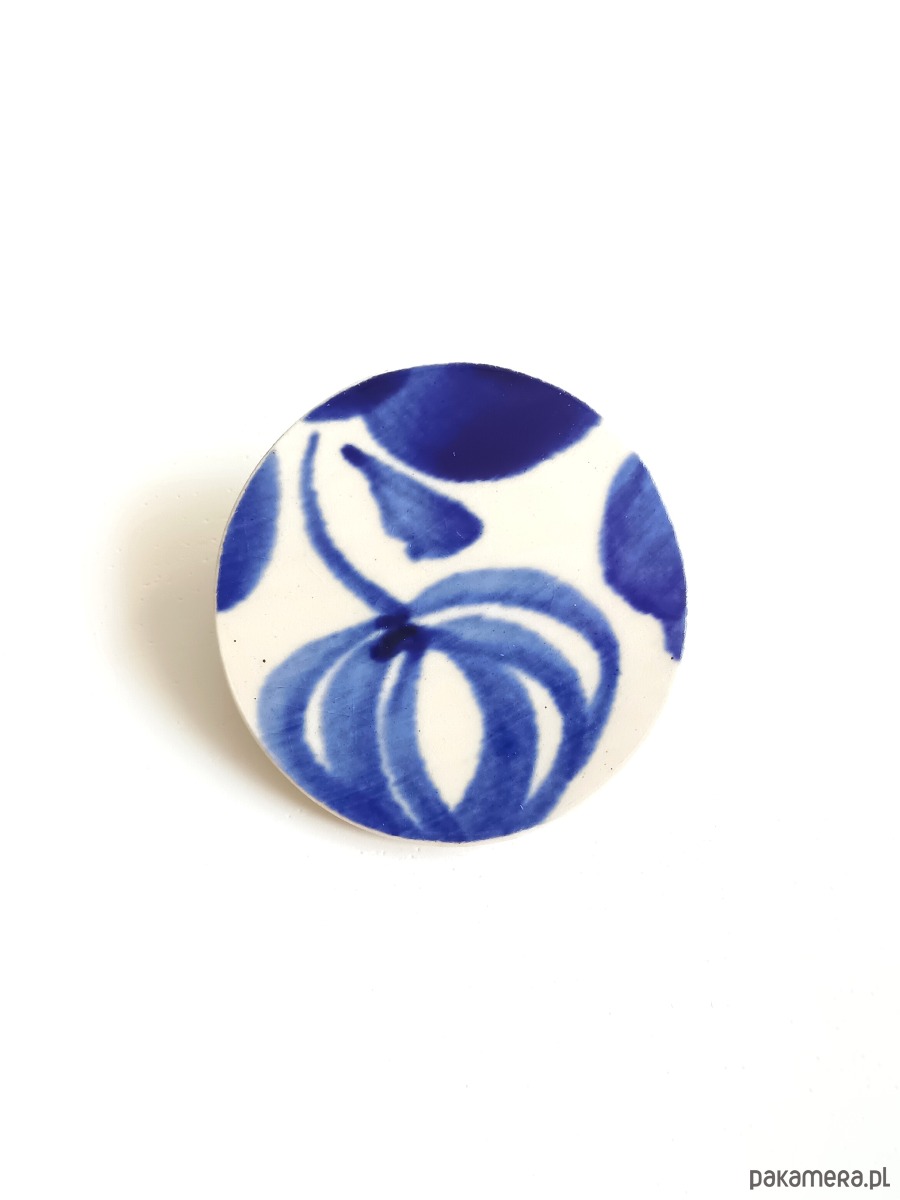 Historia fajansu włocławskiego sięga 1873 roku. Zakładów było kilka, zmieniali się właściciele i lokalizacje. Produkcja najbardziej rozwinęła się po II WŚ, kiedy w miejscowych zakładach powstawał nie tylko fajans, ale również porcelit i porcelana. Zróżnicowane było także wzornictwo - produkowano nie tylko naczynia, ale również elementy wyposażenia wnętrz (lampy, świeczniki, żyrandole). Mimo tej różnorodności, najbardziej rozpoznawalnym wyrobem z Włocławka jest talerz w ręcznie malowane kobaltowe kwiaty (z takich najchętniej korzystam :). I mimo, że najdłużej działająca fabryka zakończyła działalność w 1991 roku, dzięki lokalnym inicjatywom produkcja fajansu została wznowiona i trwa do dziś! Oto broszka, którą wykonałam z fragmentu fajansu włocławskiego, ręcznie malowanego w kobaltowe kwiaty. Kawałek stłuczki oszlifowałam w okrągły kształt i połączyłam z metalowym zapięciem. Ceramikę zeszlifowałam również z grubości, dzięki czemu broszka nie jest masywna. Brzegi pokryłam lakierem, co sprawia, że nie brudzą się i nie chłoną wilgoci. Średnica elementu ceramicznego: 40 mm. Unikat - każdy z moich wyrobów występuje w jednym egzemplarzu. Upcykling - nie reprodukuję wykorzystywanych wzorów, niczego nie domalowuję - wykorzystuję wyłącznie oryginalne naczynia i motywy, które się na nich znajdują. Tym samym, stłuczce z odzysku nadaję nowe życie.