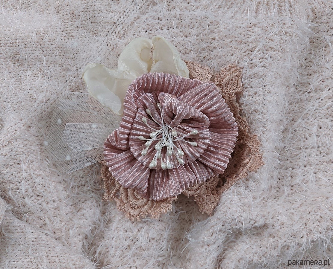 Ta broszka ozdobi nawet najprostszą kreację, dodając jej szyku i niepowtarzalności. Będzie elegancką ozdobą żakietu, dzianinowej sukienki czy golfu. Została misternie wykonana ręcznie poprzez połączenie różnych tkanin i faktur. Jedyny egzemplarz.